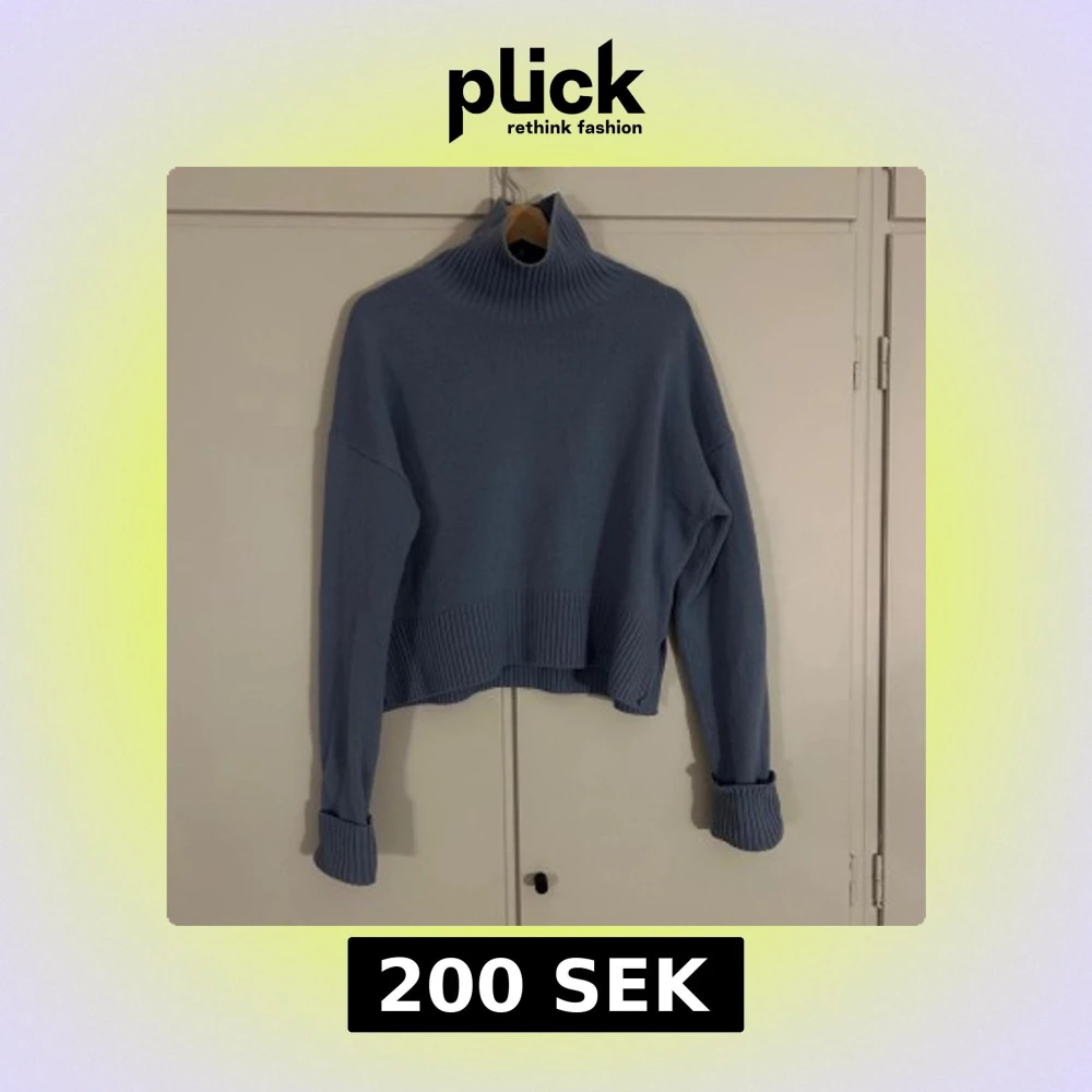 Säljer en snygg blå stickad tröja med ribbade detaljer.den har några fläckar på baksidan av ärmen men det är inget man tänker på💙