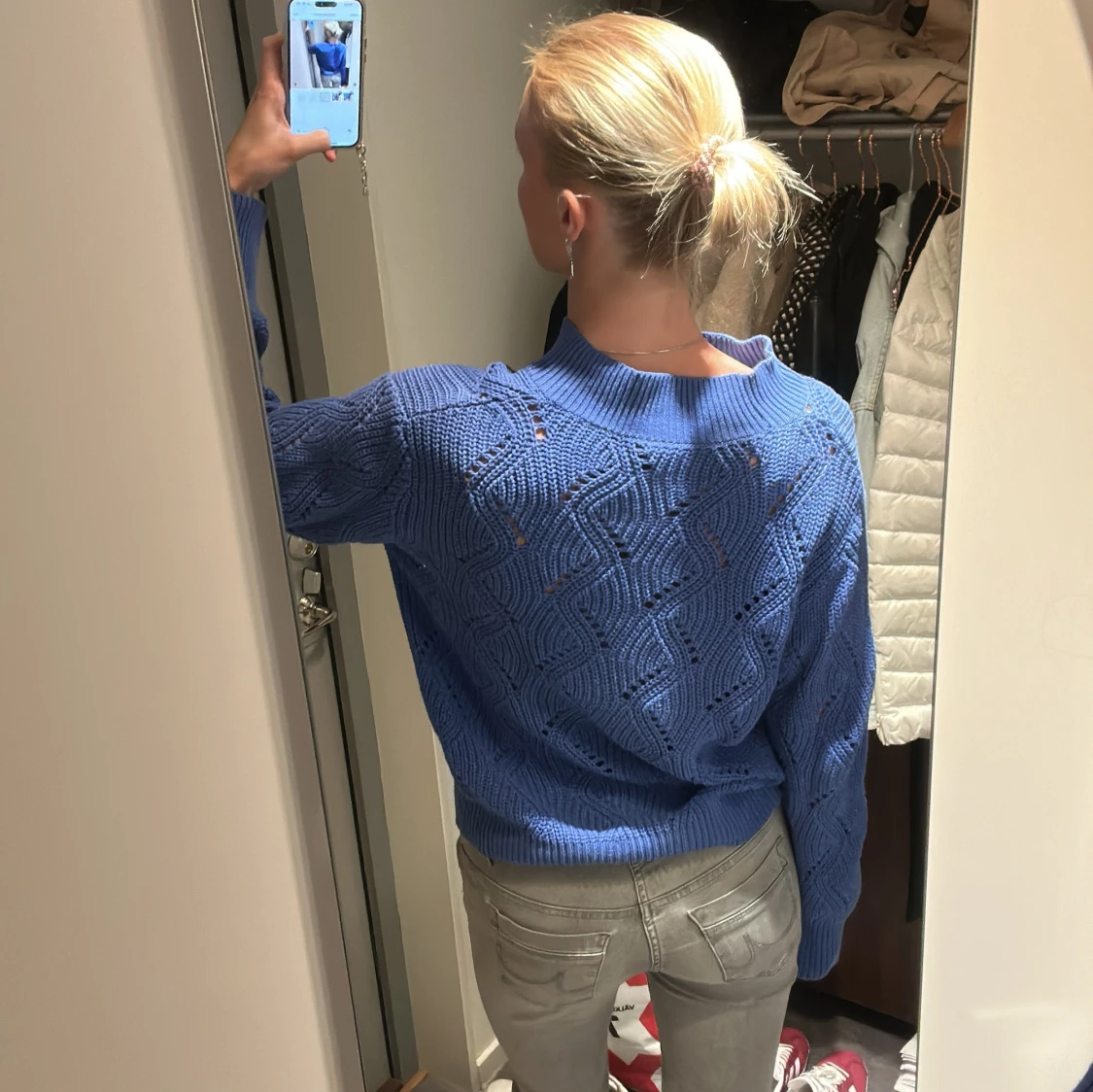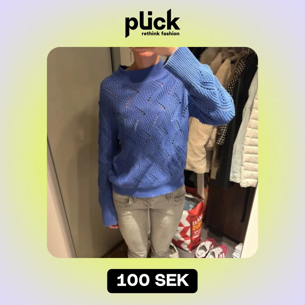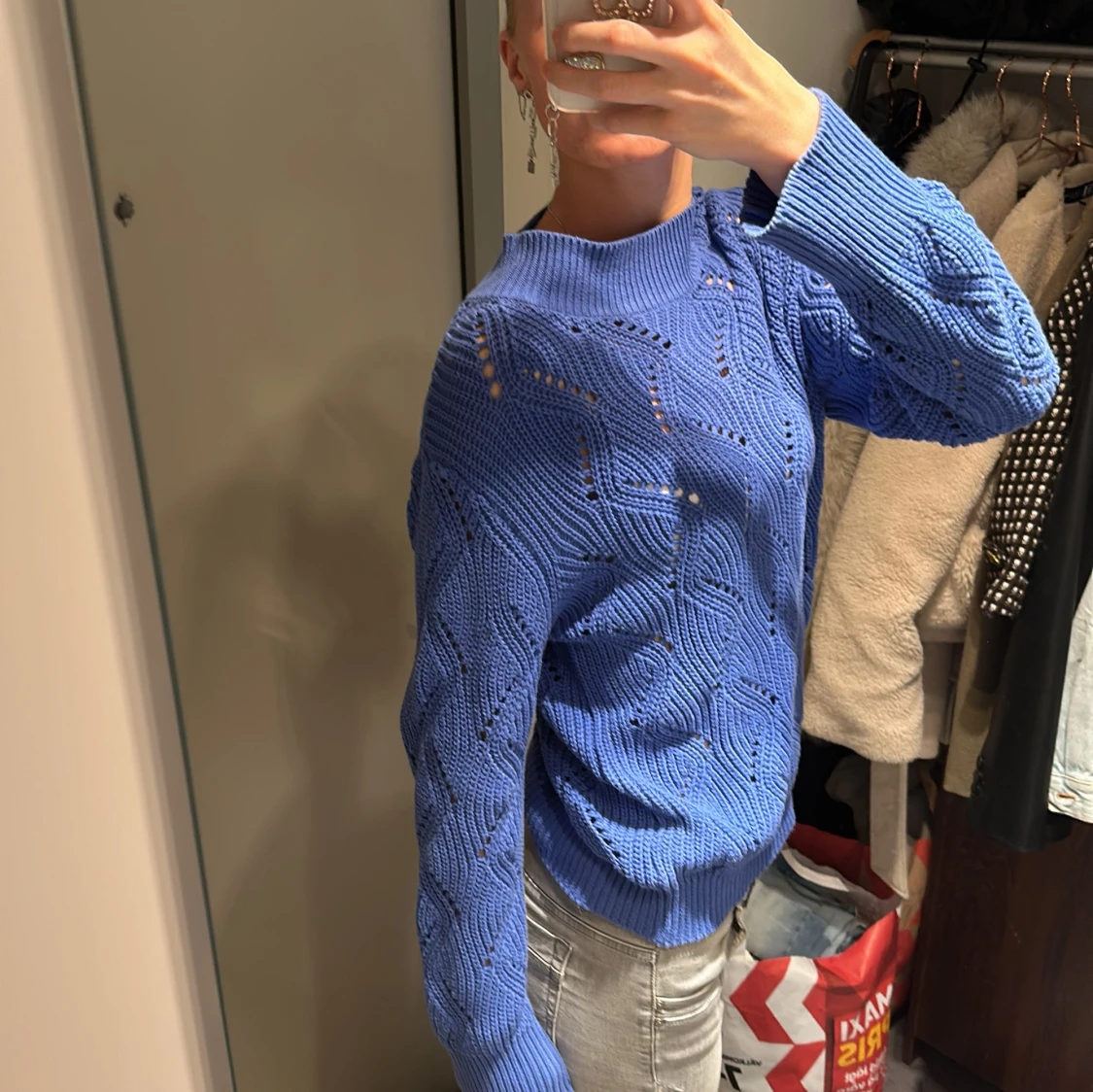 Säljer en superfin blå stickad tröja som är perfekt nu i höst. Tröjan är både mysig och trendig, älskar den blå färgen😍