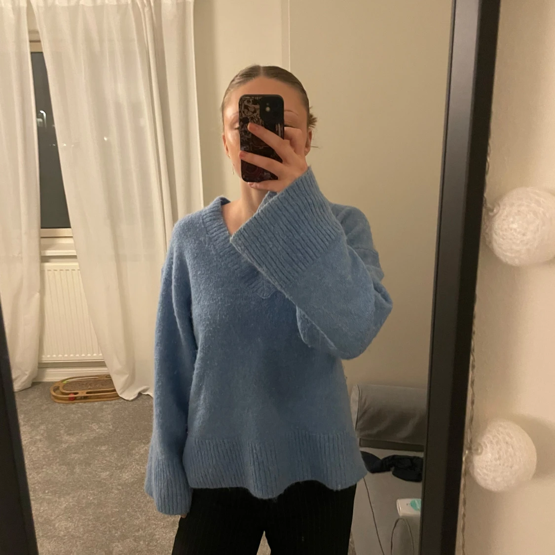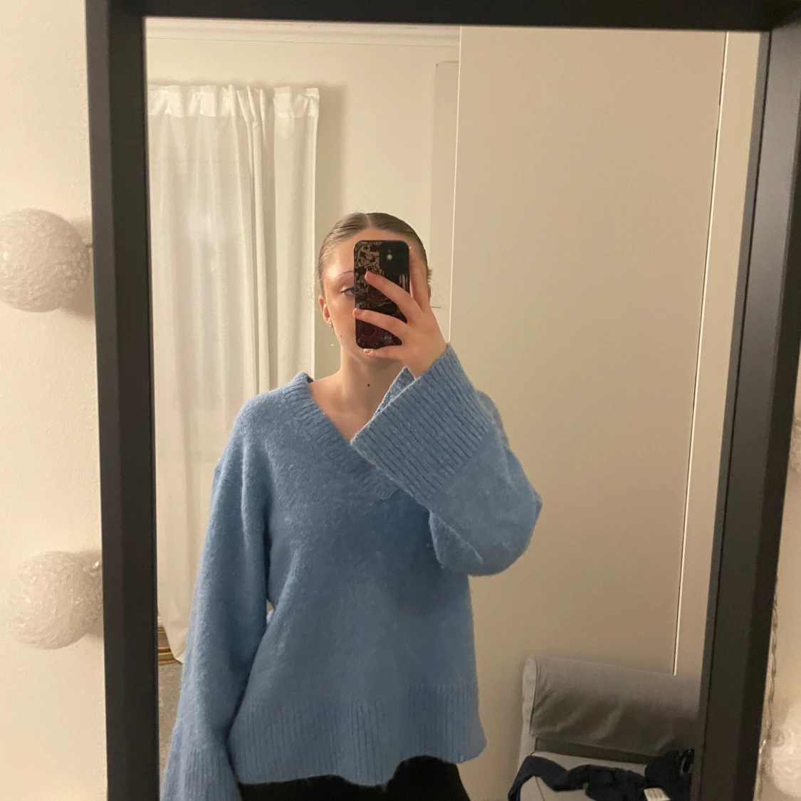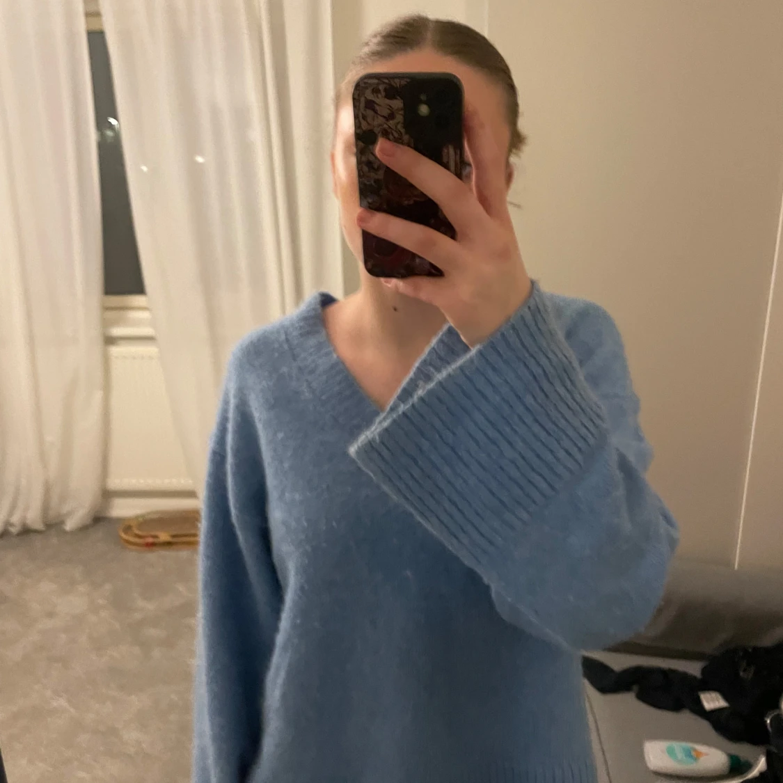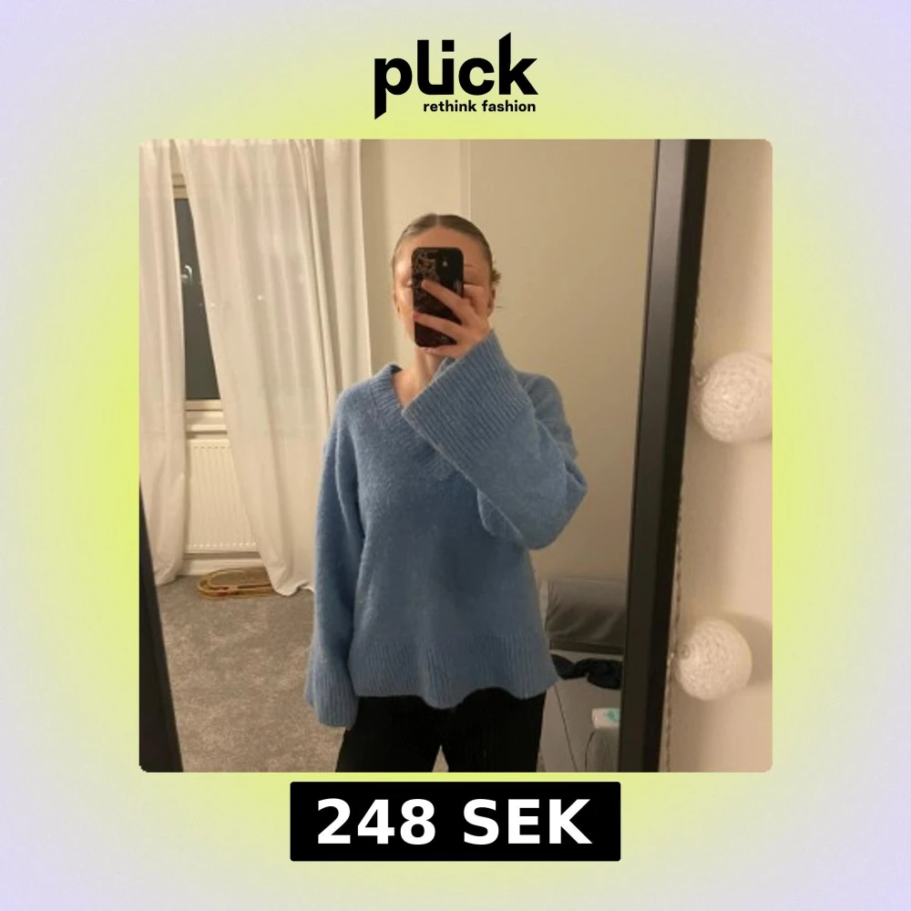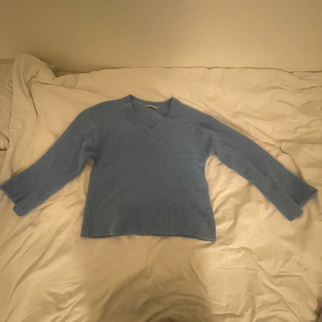 Mysig blå stickad tröja med v-ringning och vida ärmar. 💘 Köpt för ett halvår sedan för 600 men säljer nu för 248kr.💘 Väl omhändertagen! Bra kvalitet och INTE sticksig. :)