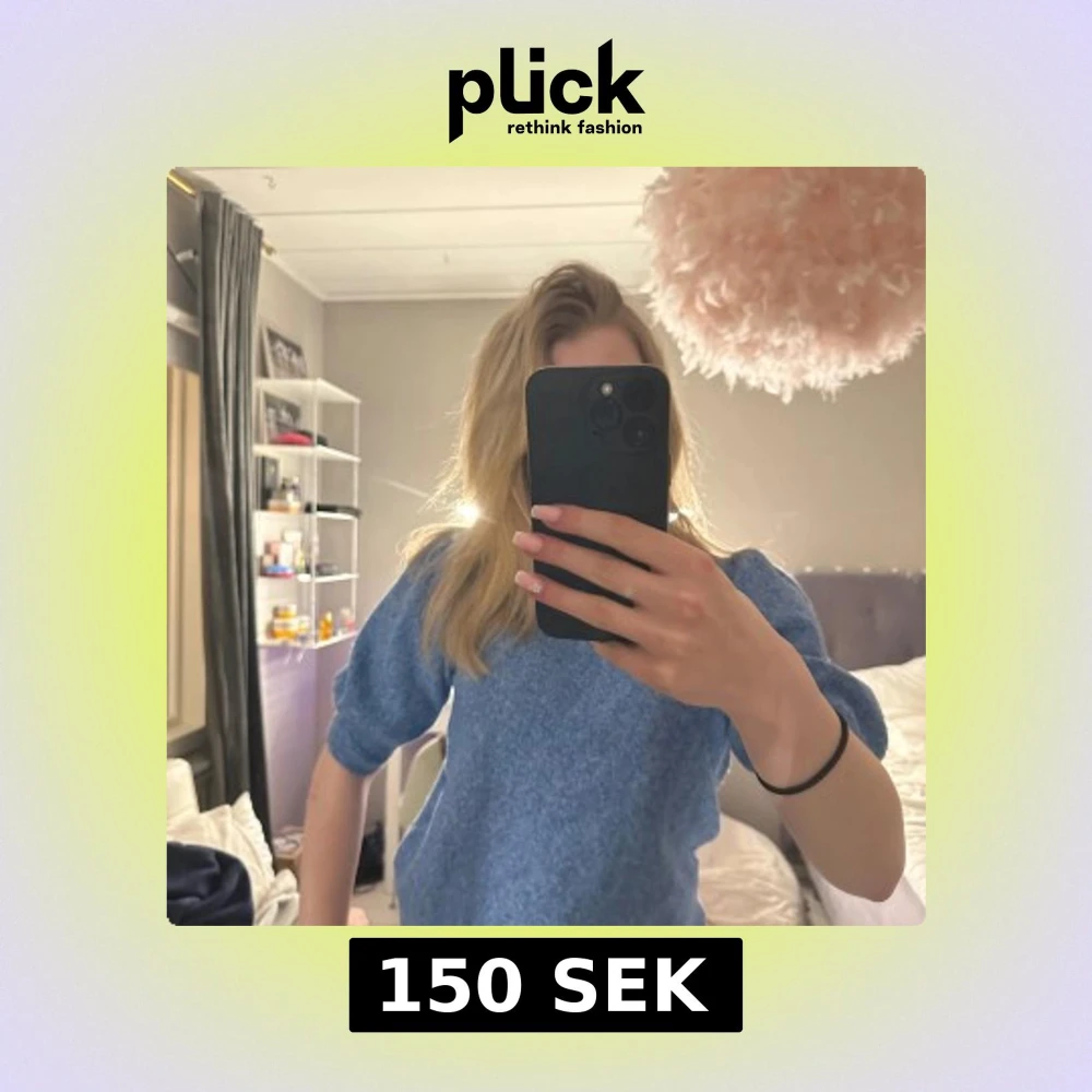 Säljer en mysig blå stickad tröja med trekvartsärm. Perfekt nu till våren och sommaren💕
