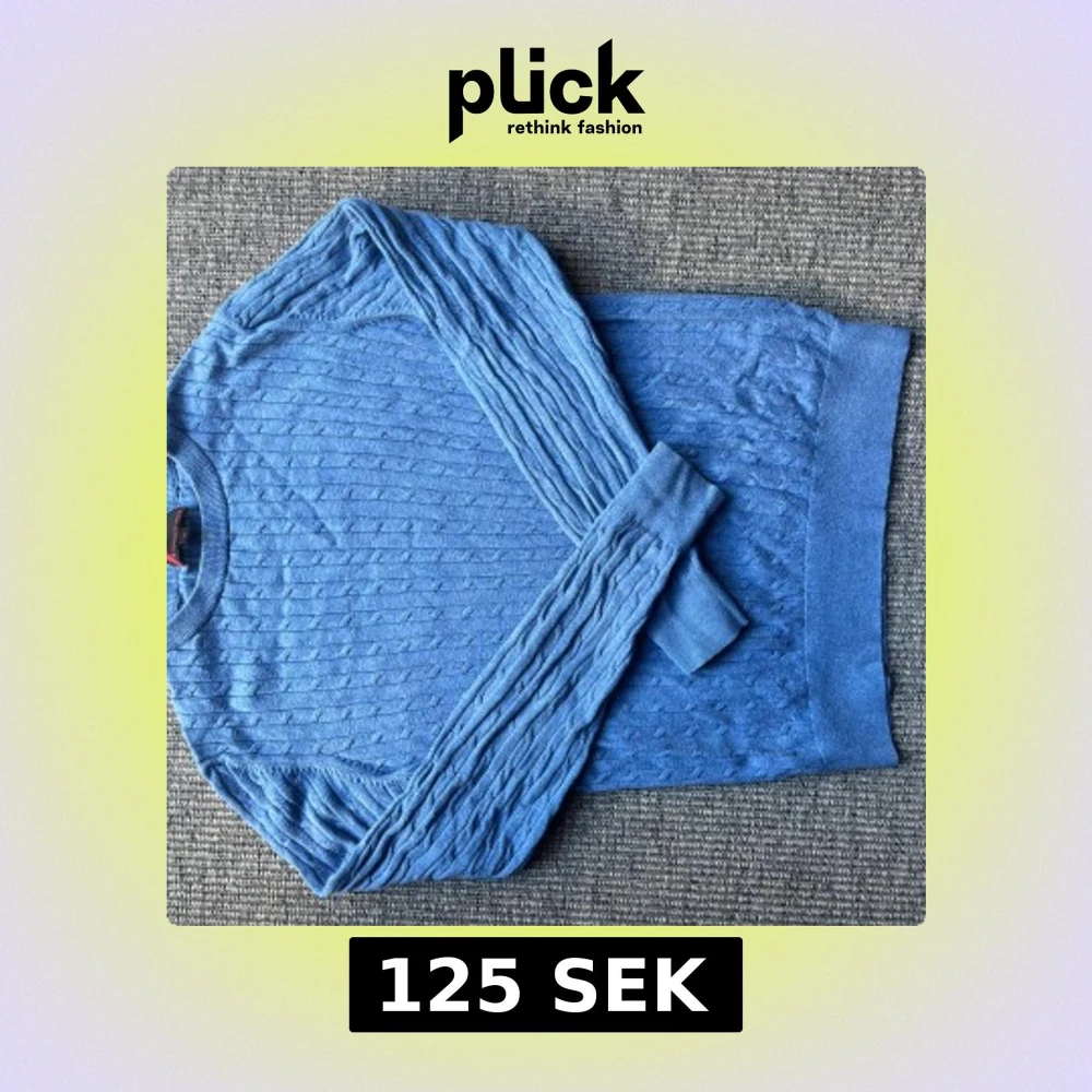 Säljer en blå stickad tröja från Dressmann i storlek S. Tröjan har ett klassiskt kabelstickat mönster, rund halsringning och långa ärmar. Perfekt för lager-på-lager och chill stil under kyligare dagar.