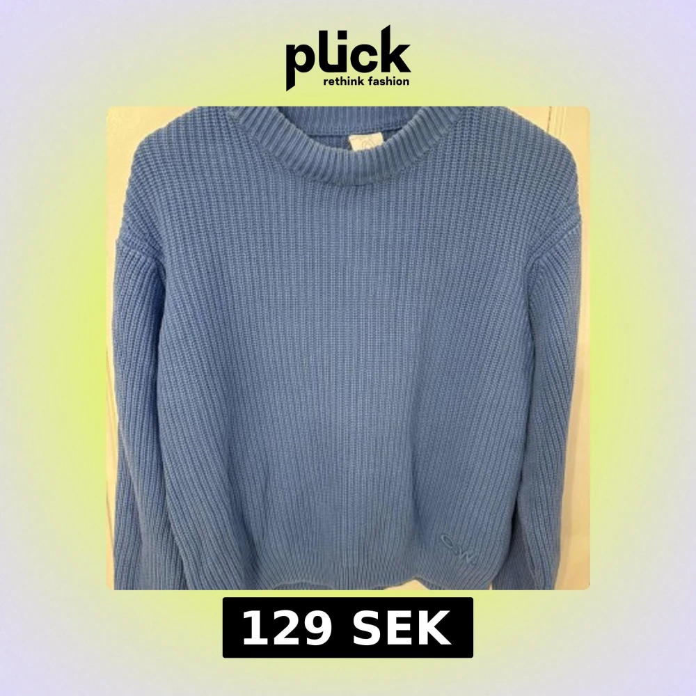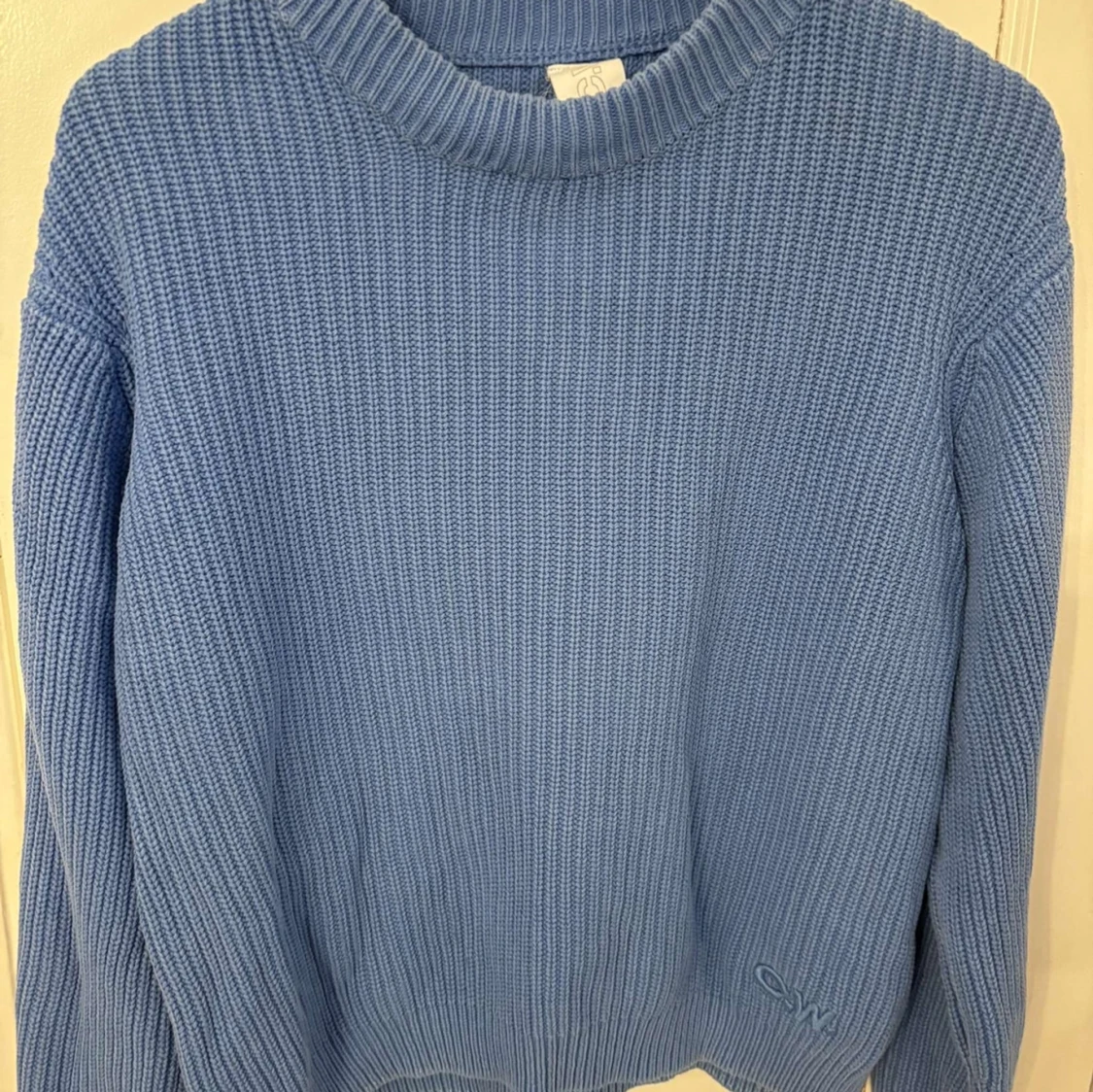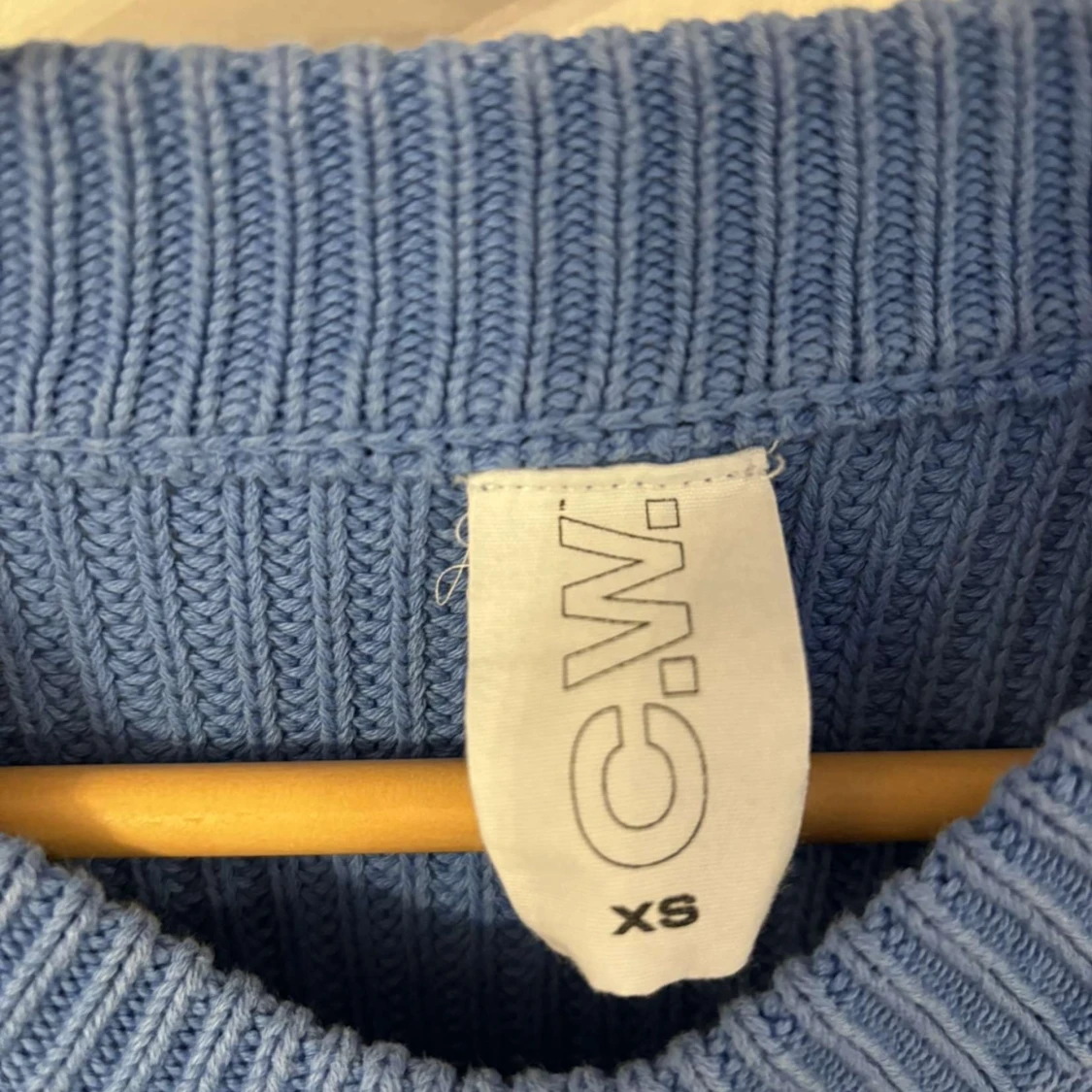 Säljer en snygg blå stickad tröja från C.W. med en klassisk rund halsringning. Perfekt för kyliga dagar med sin mjuka och bekväma passform. Tröjan har långa ärmar och en stilren design.