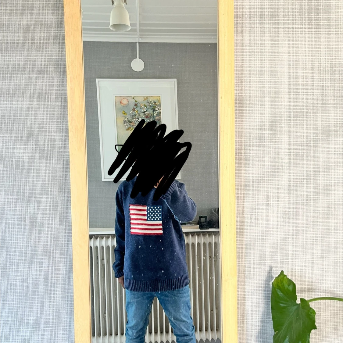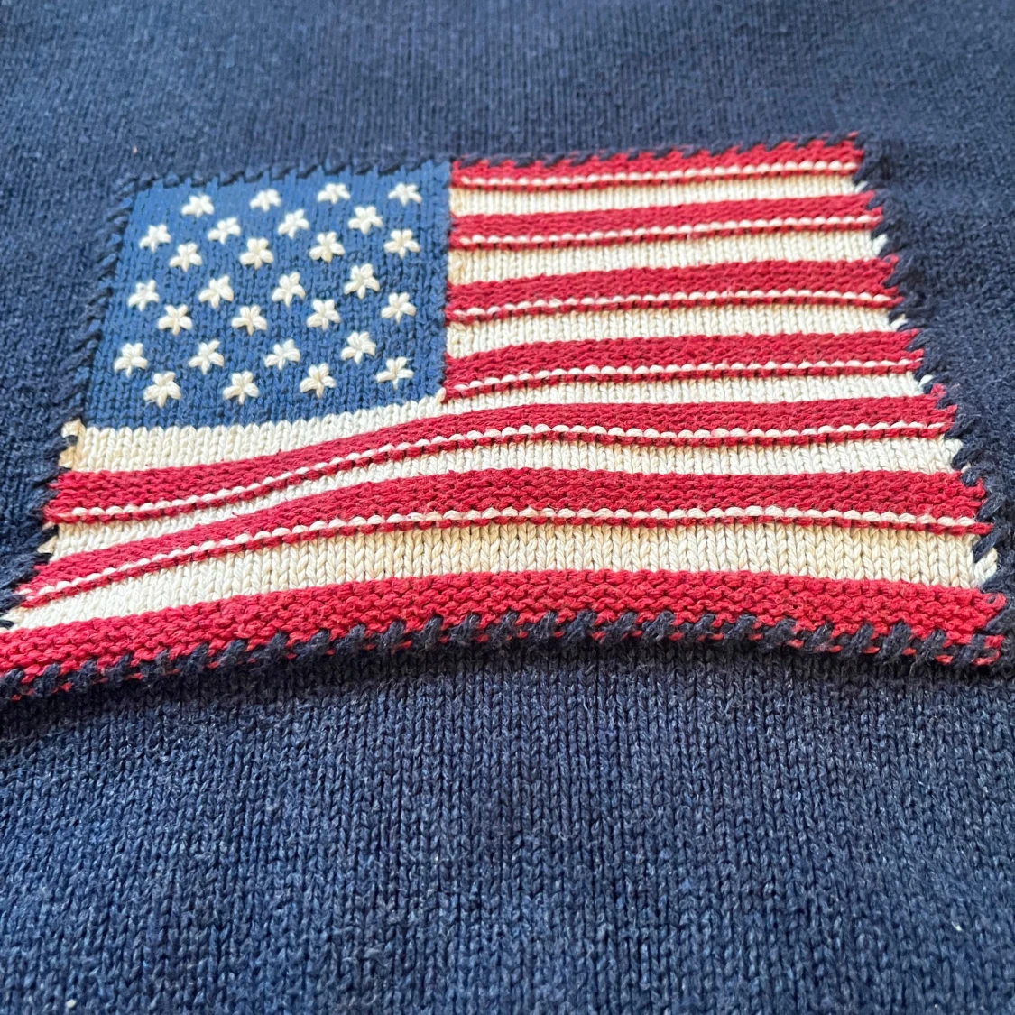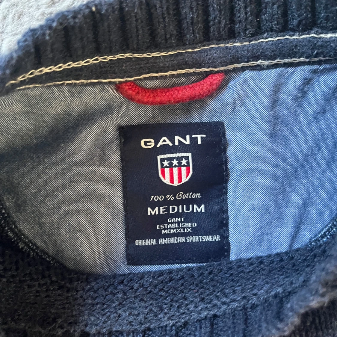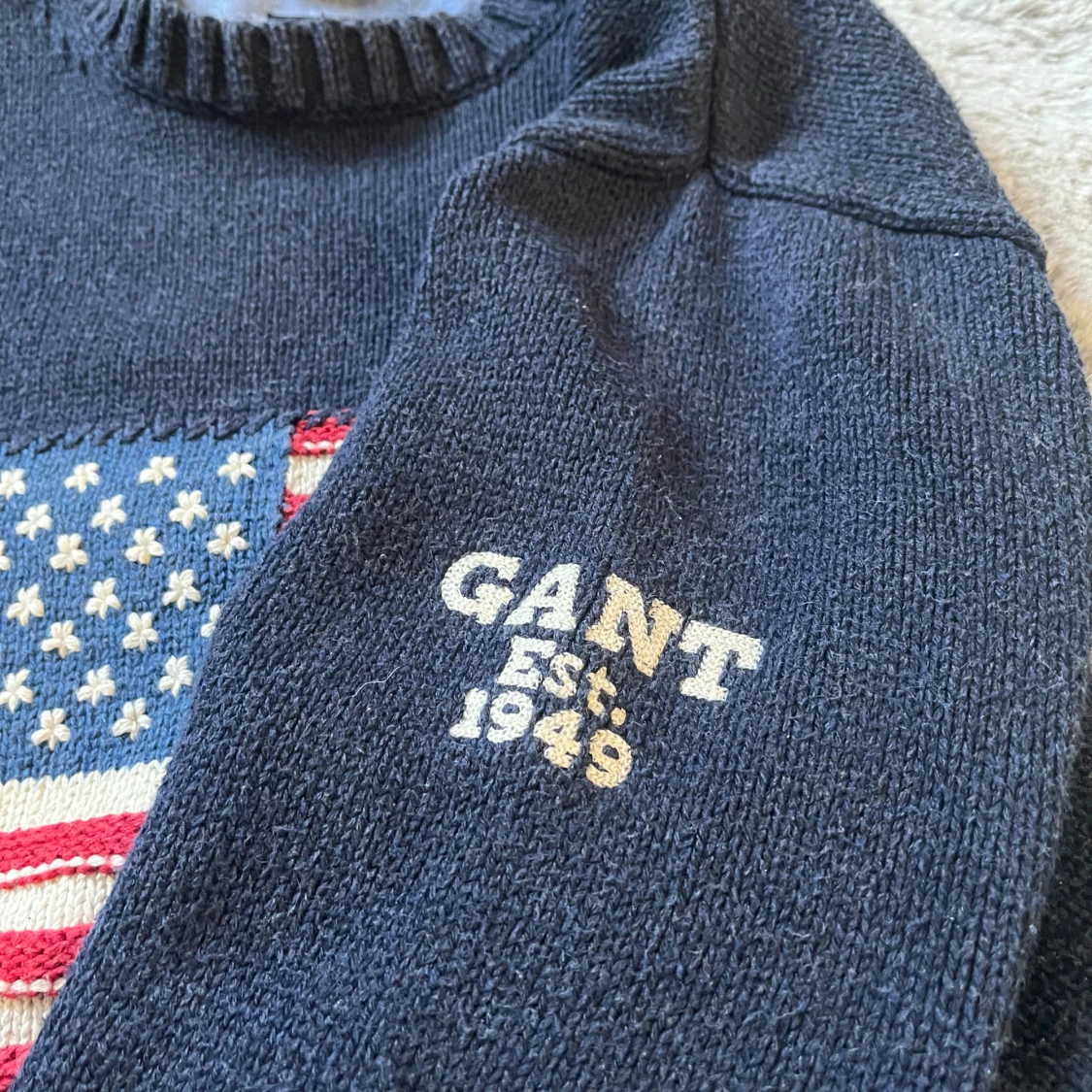Säljer en blå stickad tröja från GANT med ett stort amerikanskt flaggmotiv på framsidan. Tröjan har långa ärmar och en rund halsringning. Perfekt för en avslappnad stil med en touch av amerikansk inspiration. Priset kan diskuteras! Men går inte under 200 kr. 🤝