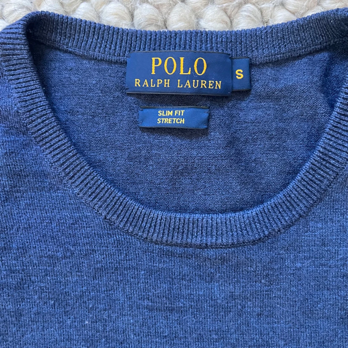 Mörkblå stickad tröja från Polo Ralph Lauren i slim fit med stretch. Tröjan är i storlek S och säljs för ett rikigt billigt pris 🙌🤩