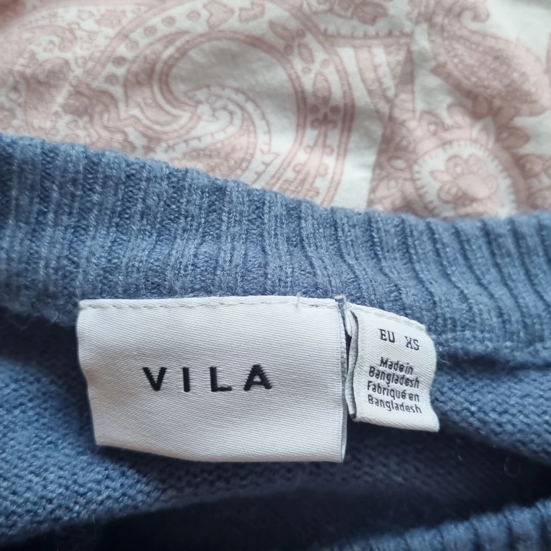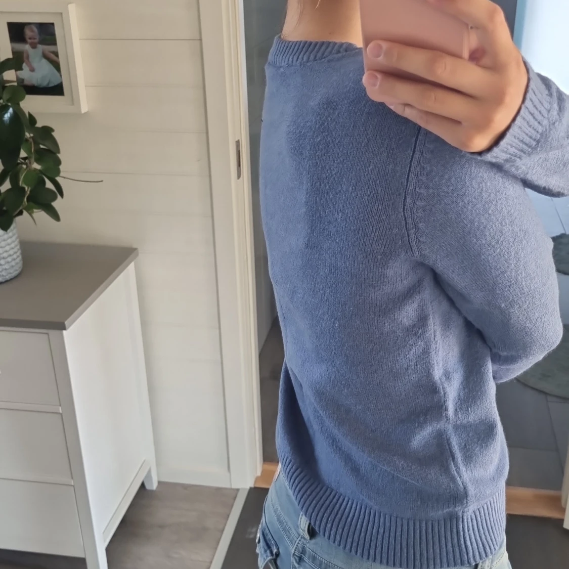 Mysig blå stickad tröja från Vila i storlek XS. Tröjan har rund halsringning, ribbade muddar vid ärmslut och nederkant samt lång ärm. Perfekt att slänga på sig till jeans för en chill look.