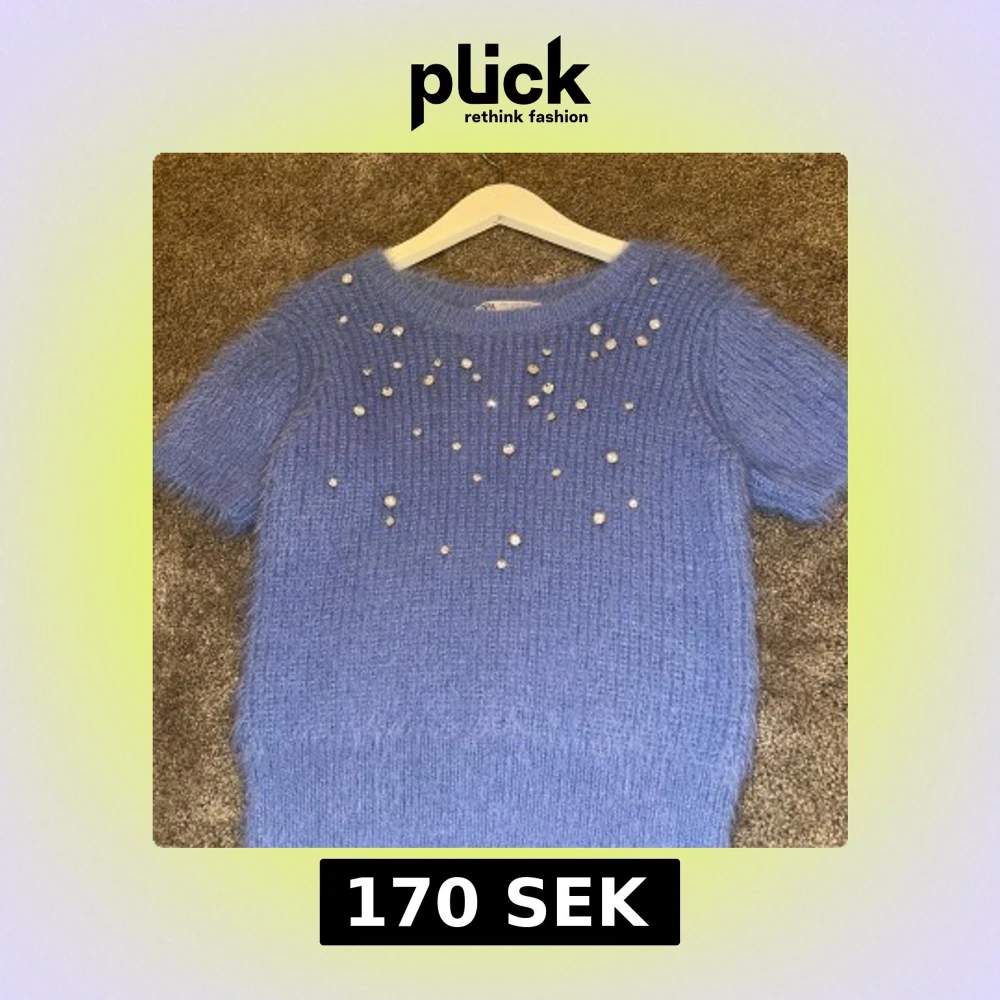 Säljer en mysig blå stickad tröja från Zara med korta ärmar och pärldetaljer framtill. Perfekt för att ge en touch av elegans till din outfit. Tröjan har en rund halsringning och är supermjuk.