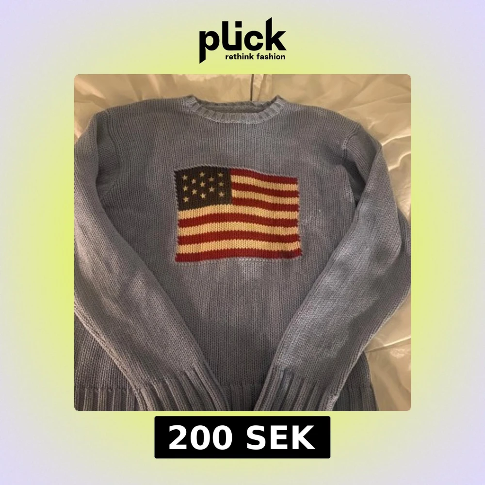 Säljer en blå stickad tröja från Ralph Lauren med en stor amerikansk flagga på framsidan. Tröjan har långa ärmar och ribbade muddar vid ärmslut och nederkant, tror att det är storlek S men finns ingen lapp💗 vet ej om den är äkta men är en gammal design så tror det