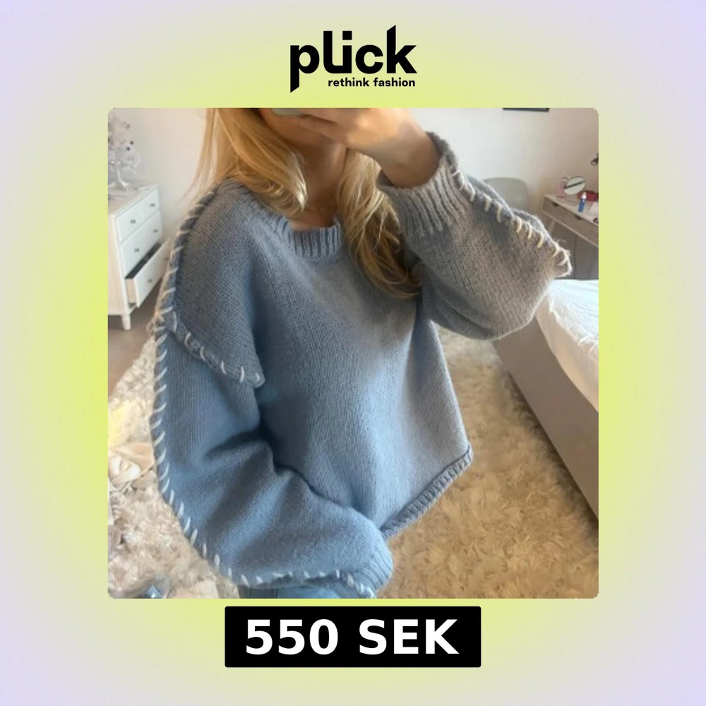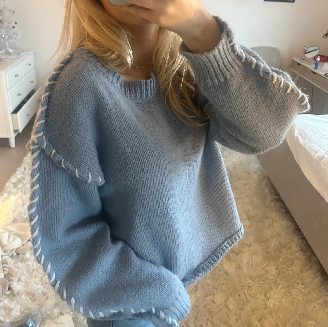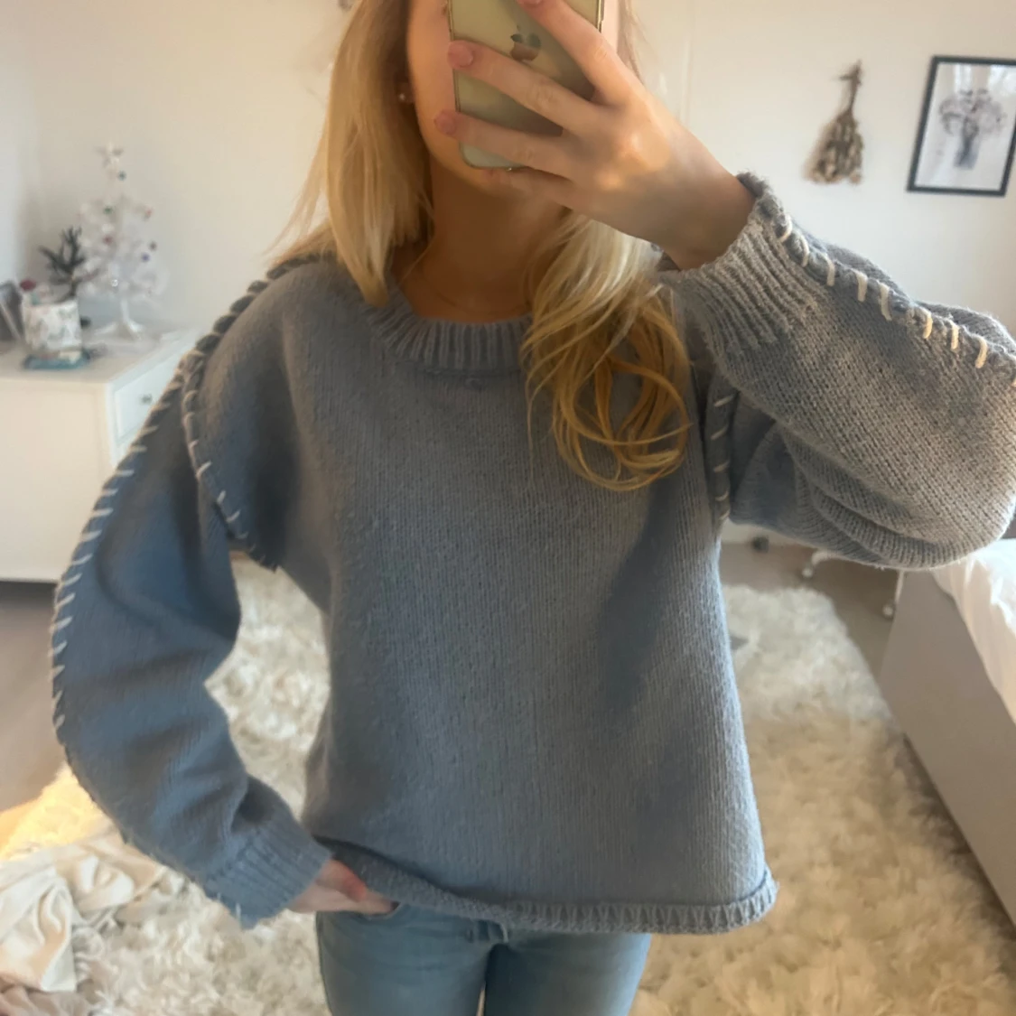 Mysig blå stickad tröja med dekorativa vita sömmar längs ärmarna och axlarna. Tröjan har en avslappnad passform och långa ärmar, perfekt för kyligare dagar.