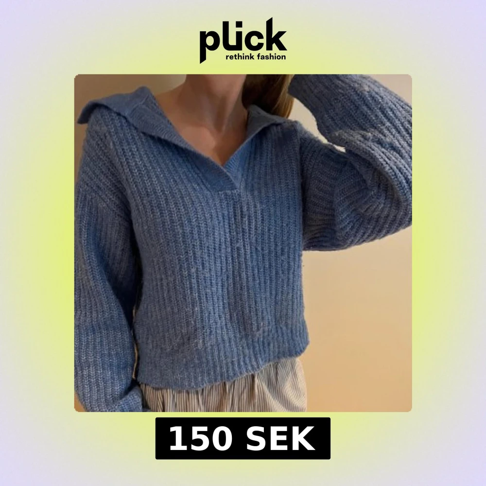 Mysig blå stickad tröja med bred krage och v-ringning. Lite nopprig💗