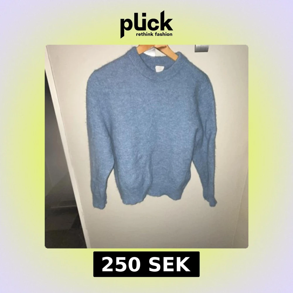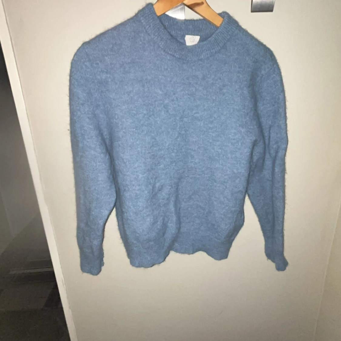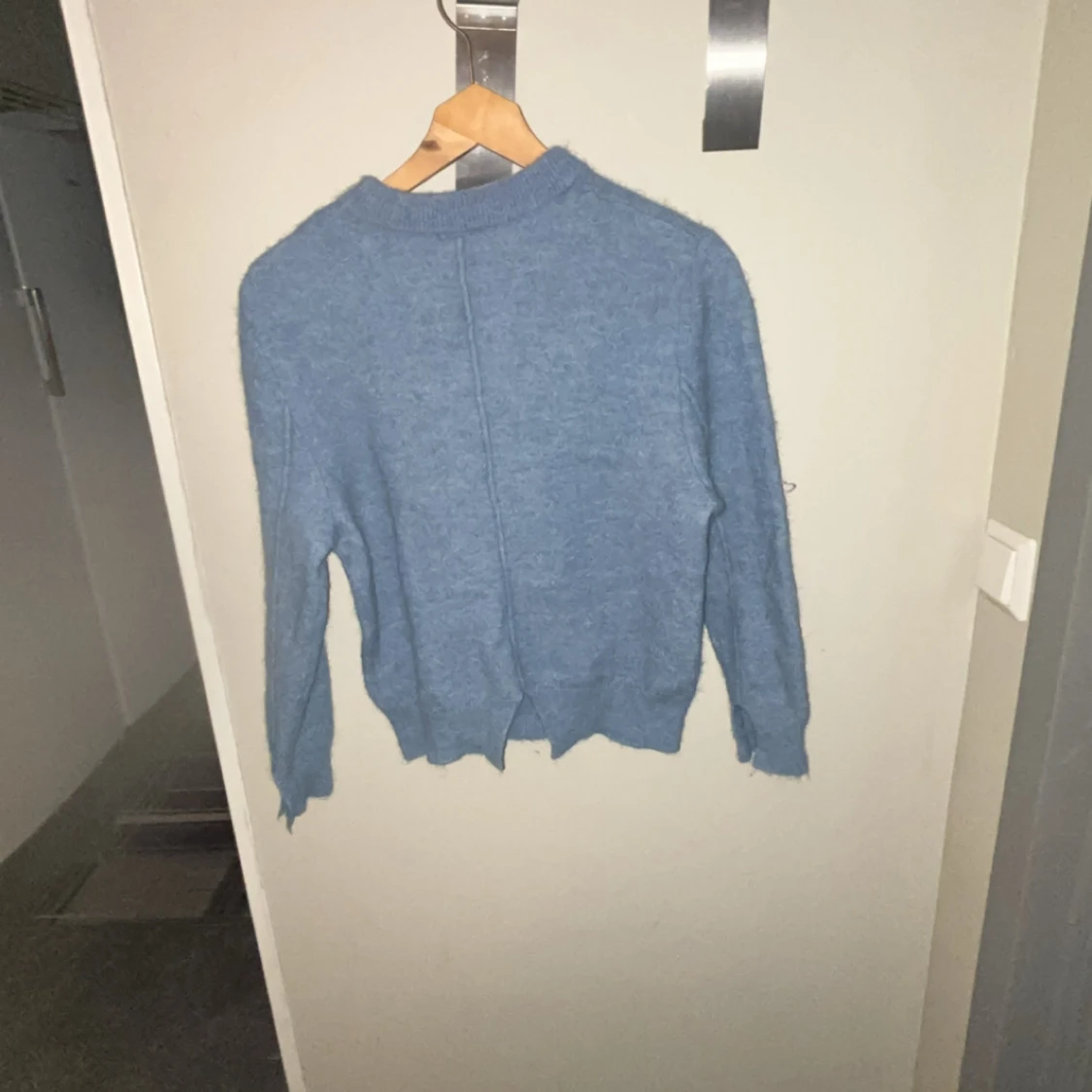 Mysig blå stickad tröja med rund hals och långa ärmar. Tröjan har en enkel design utan mönster och är tillverkad i ett fluffigt material som känns skönt mot huden. Perfekt för att hålla värmen under kyliga dagar. Tröjan har slits på baksidan och vid slutet på armarna. Inte använd mycket och inget fel heller på den❤️