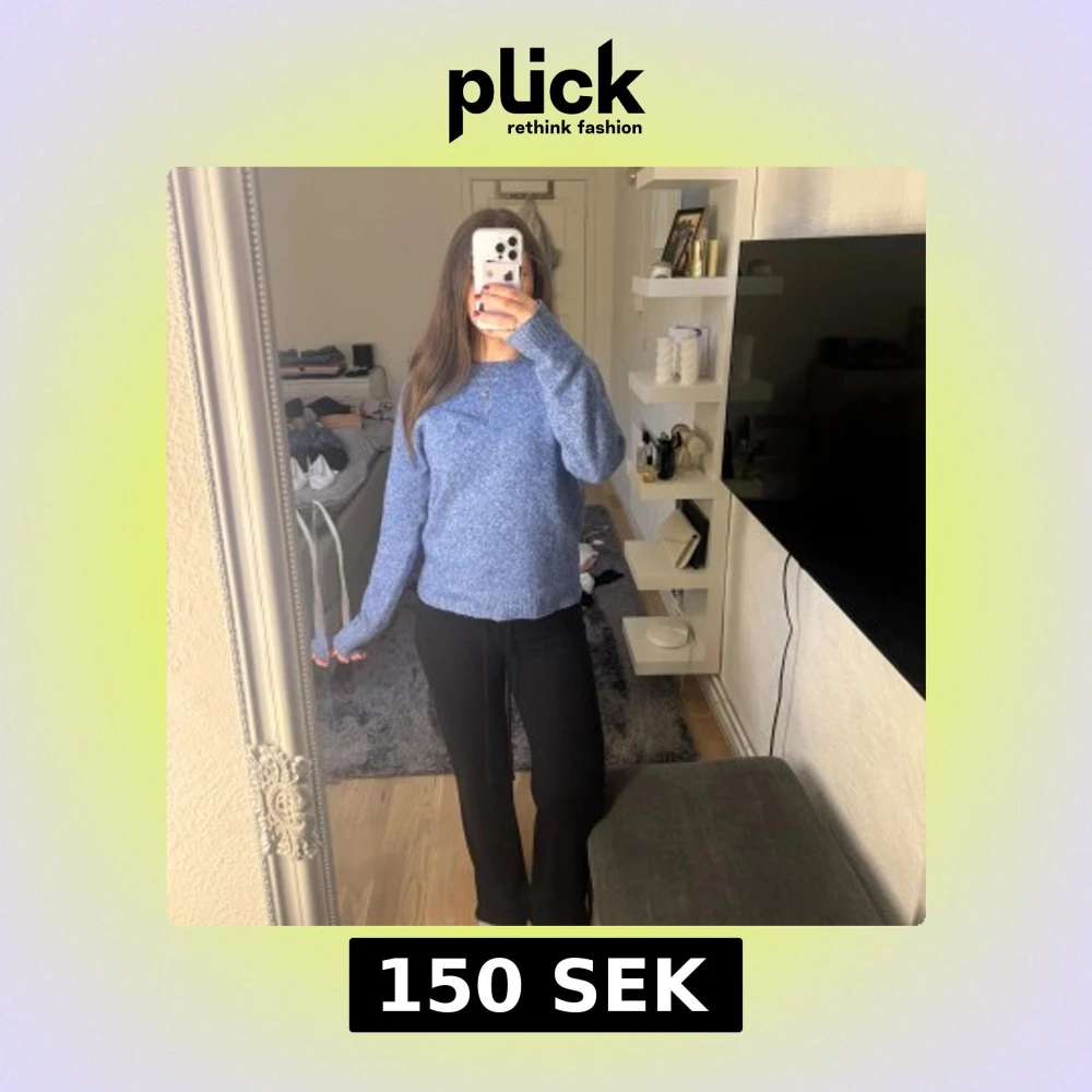 Mysig blå stickad tröja med rund halsringning och långa ärmar. Tröjan har en lätt melerad look och ribbade muddar vid ärmslut och nederkant. Perfekt för lager-på-lager under kyliga dagar.
