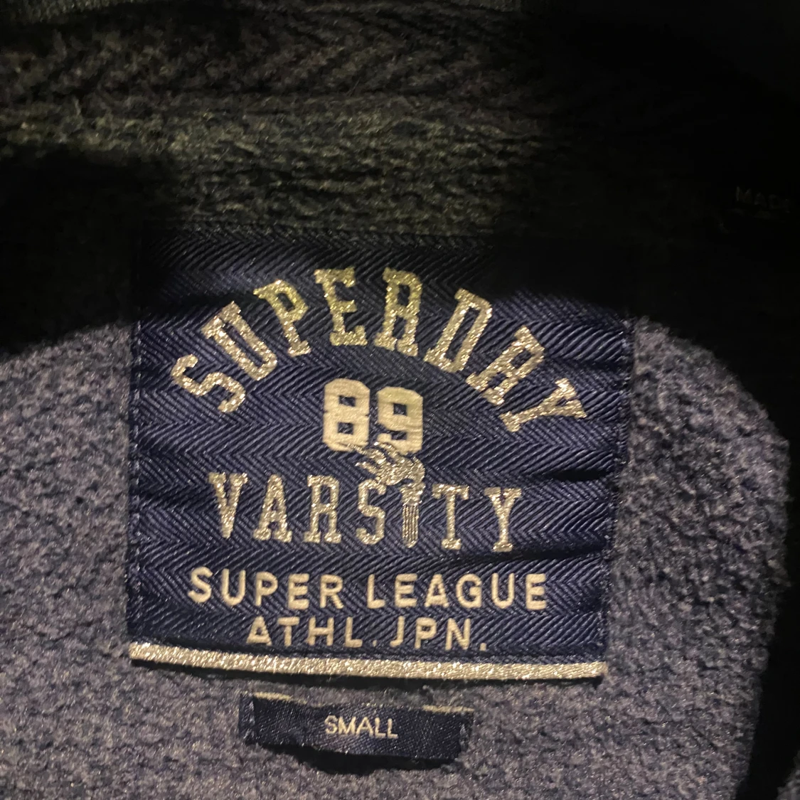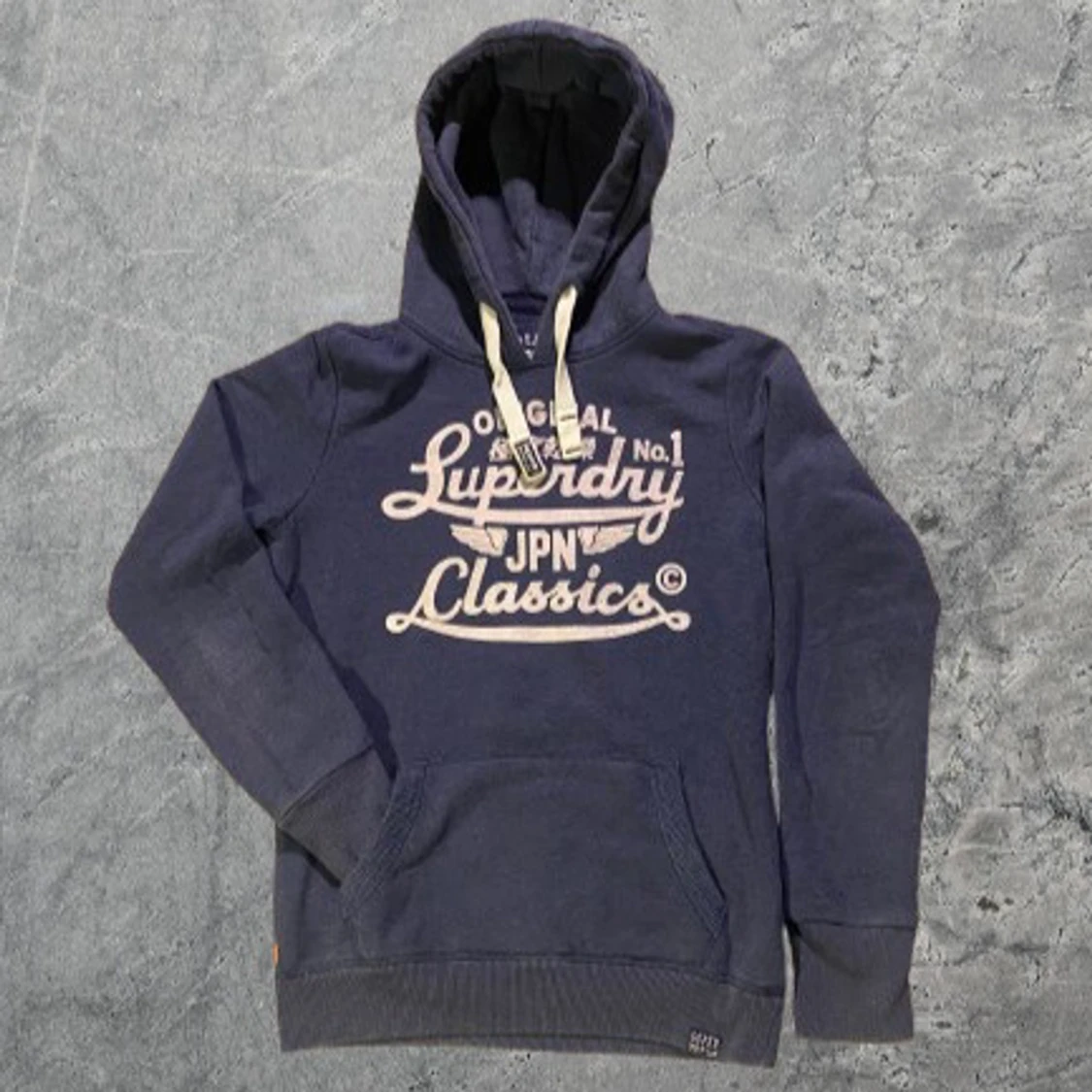Säljer en marinblå hoodie från Superdry med stort vitt tryck på bröstet och klassiska snören i huvan. Tröjan har känguruficka, ribbade muddar och är tillverkad i mjuk bomullsmix. Perfekt för chill dagar eller när du vill ha en sportig look. Om du undrar något är det bara att skriva, priset är inte hugget i sten✅🙌