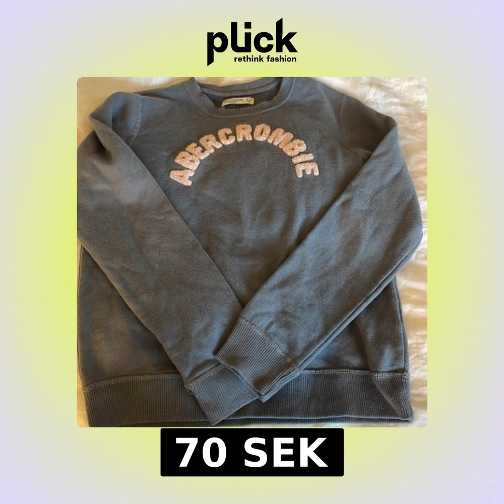 Säljer en blå sweatshirt från Abercrombie Kids med texten 'Abercrombie' i ljus rosa på framsidan. Tröjan har långa ärmar och ribbade muddar vid ärmslut och nederkant. Perfekt för en avslappnad stil.