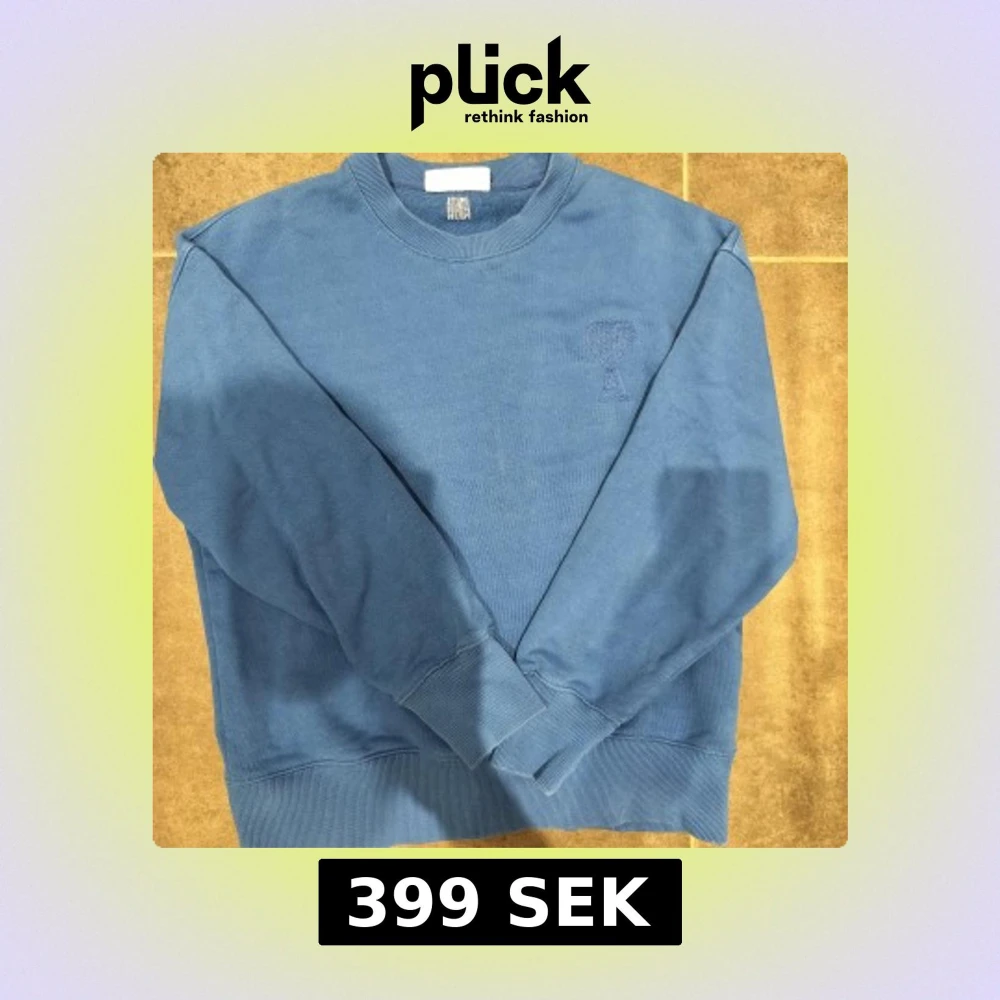 Säljer en blå sweatshirt från Ami Paris med broderad logga med hjärta och A på bröstet samt AMI-broderi på ryggen. Tröjan har rund hals, ribbade muddar och är tillverkad i mjuk bomull. Perfekt för en chill och stilren look.