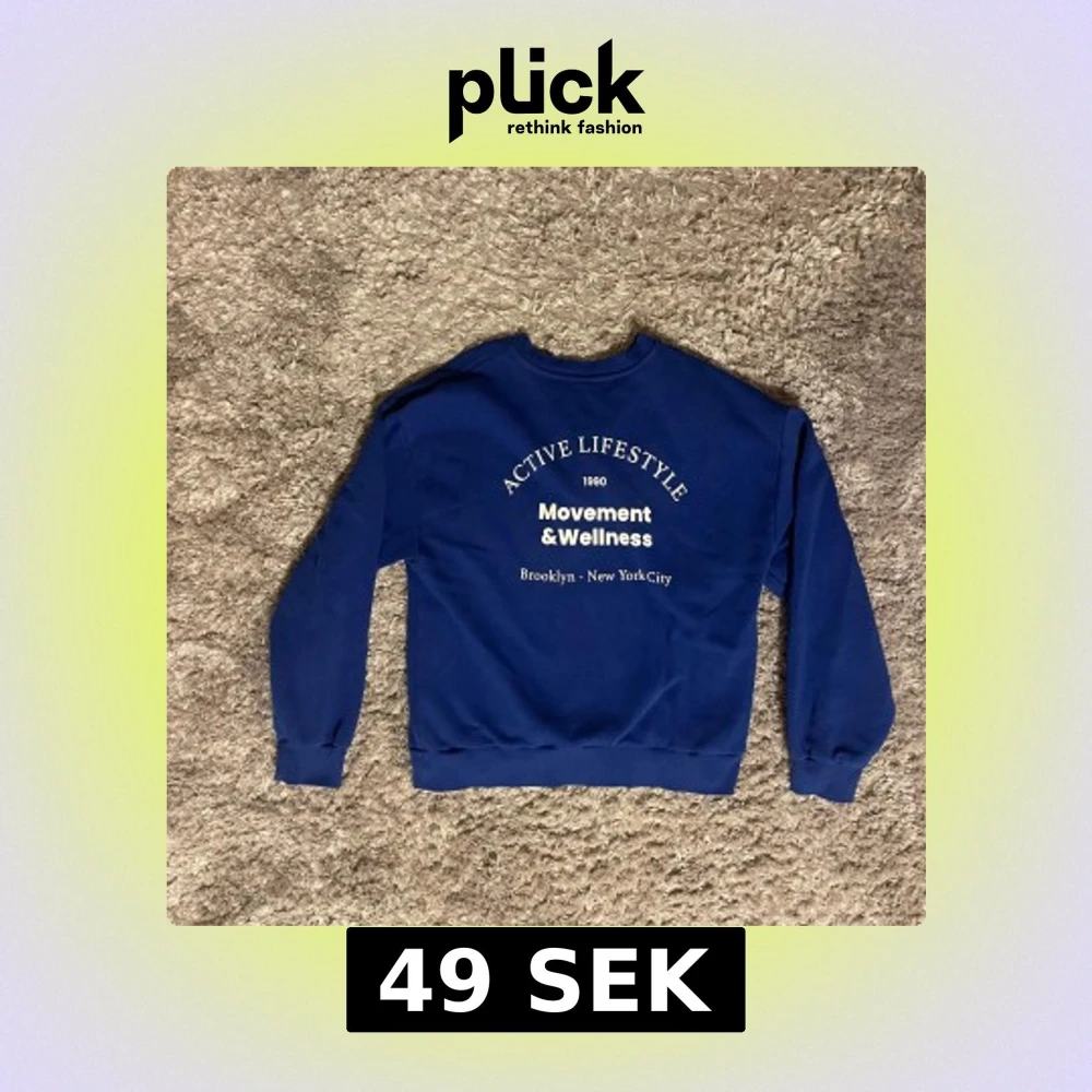 Säljer en blå sweatshirt från Gina Tricot med texten 'Active Lifestyle Movement & Wellness Brooklyn - New York City' tryckt på både fram- och baksidan. Tröjan har långa ärmar och en rund halsringning. Perfekt för en avslappnad stil.
