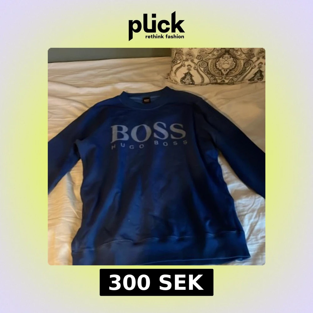 Säljer en blå sweatshirt från Hugo Boss med stor BOSS-logga framtill. Tröjan har rund halsringning, långa ärmar och är tillverkad i mjuk bomullsmix. Perfekt för dig som gillar stilrena och klassiska plagg med en modern touch.