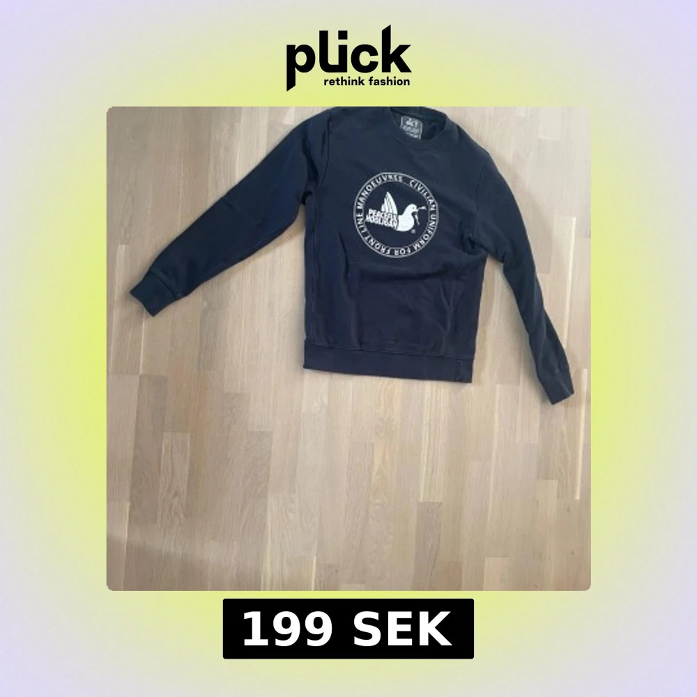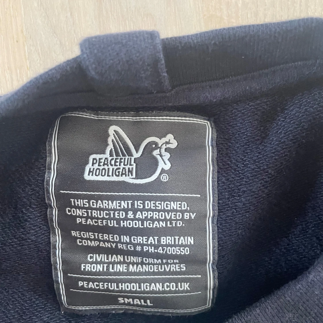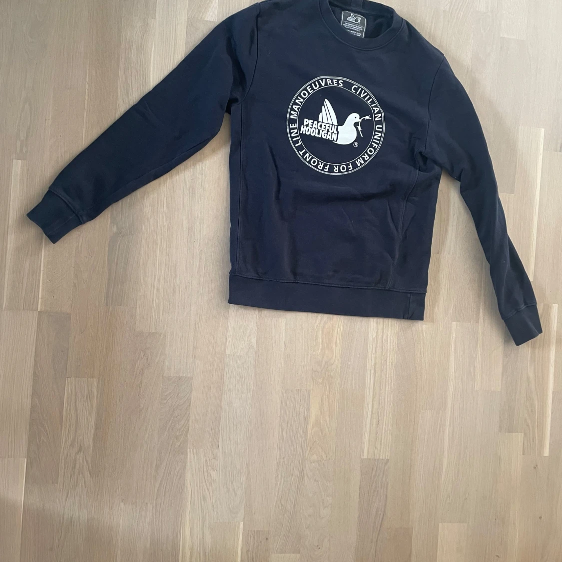 Blå sweatshirt från Peaceful Hooligan med stort vitt tryck på bröstet och rund hals. Tröjan har långa ärmar och ribbade muddar vid ärmslut och nederkant. Perfekt för dig som gillar streetwear och vill ha en clean look med tydlig logga.