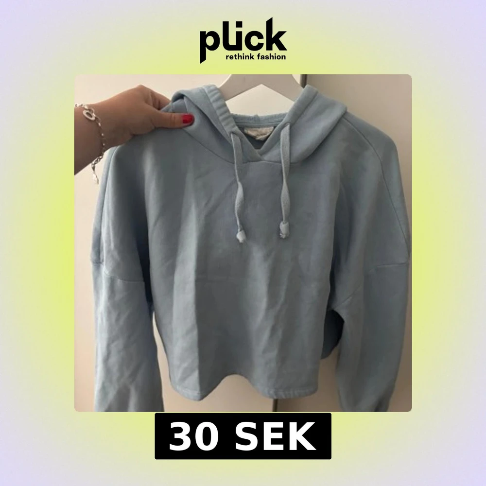 Fin croppad ljusblå hoodie med huva och snörning framtill. Tillverkad i bomullsmaterial.