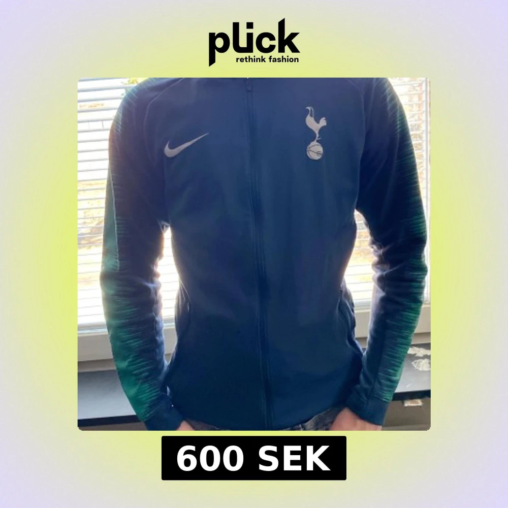 Säljer en blå träningsjacka från Nike med Tottenham Hotspur-logga på bröstet. Jackan har långa ärmar med gröna detaljer och en dragkedja framtill. Perfekt för fotbollsträning eller som en sportig vardagsjacka.