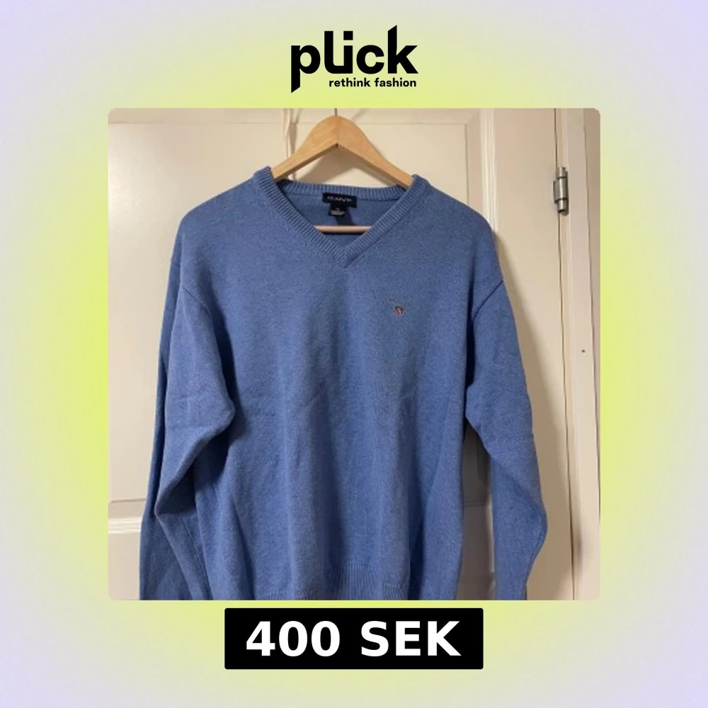 Säljer en stilren blå tröja från GANT med v-ringning och ribbade kanter. . Tröjan har en liten broderad logga på bröstet.