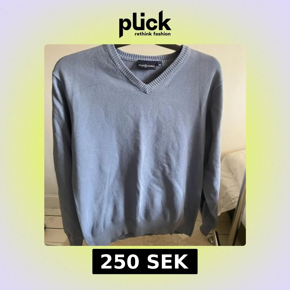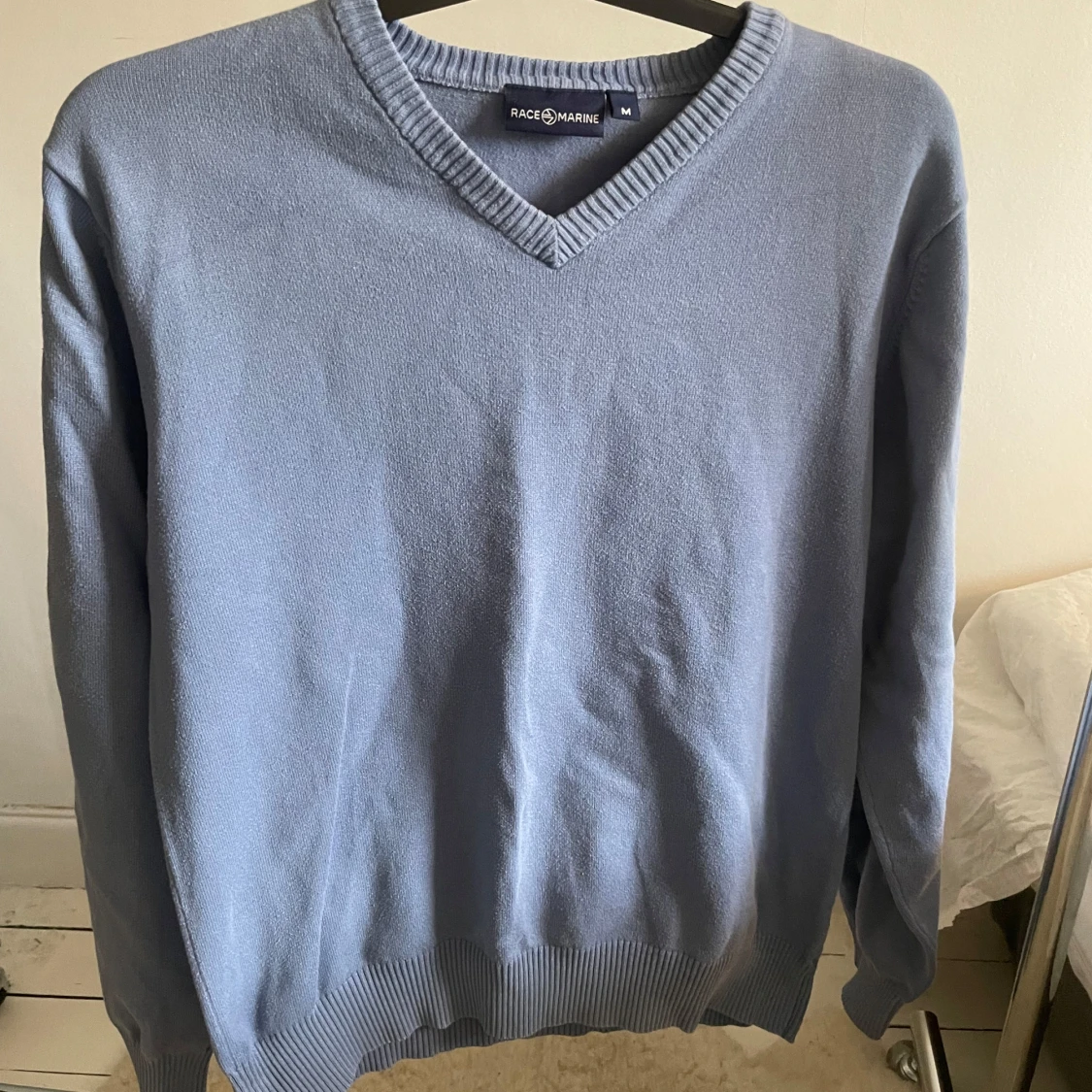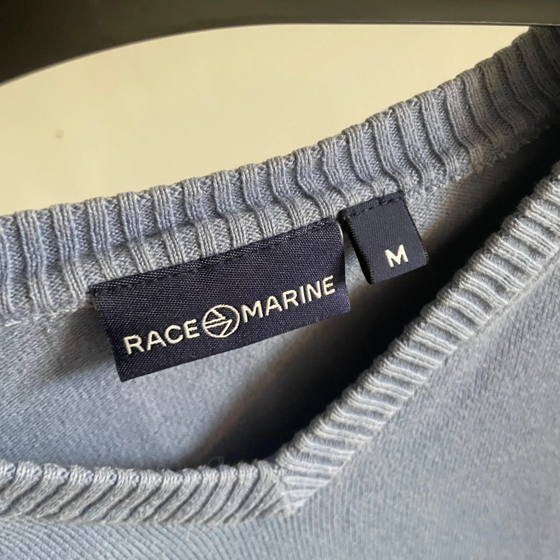 Säljer en stilren blå tröja från Race Marine i storlek M. Tröjan har en v-ringad design och är tillverkad i ett mjukt material med ribbade kanter vid hals, ärmslut och nederkant. Perfekt för en avslappnad look.