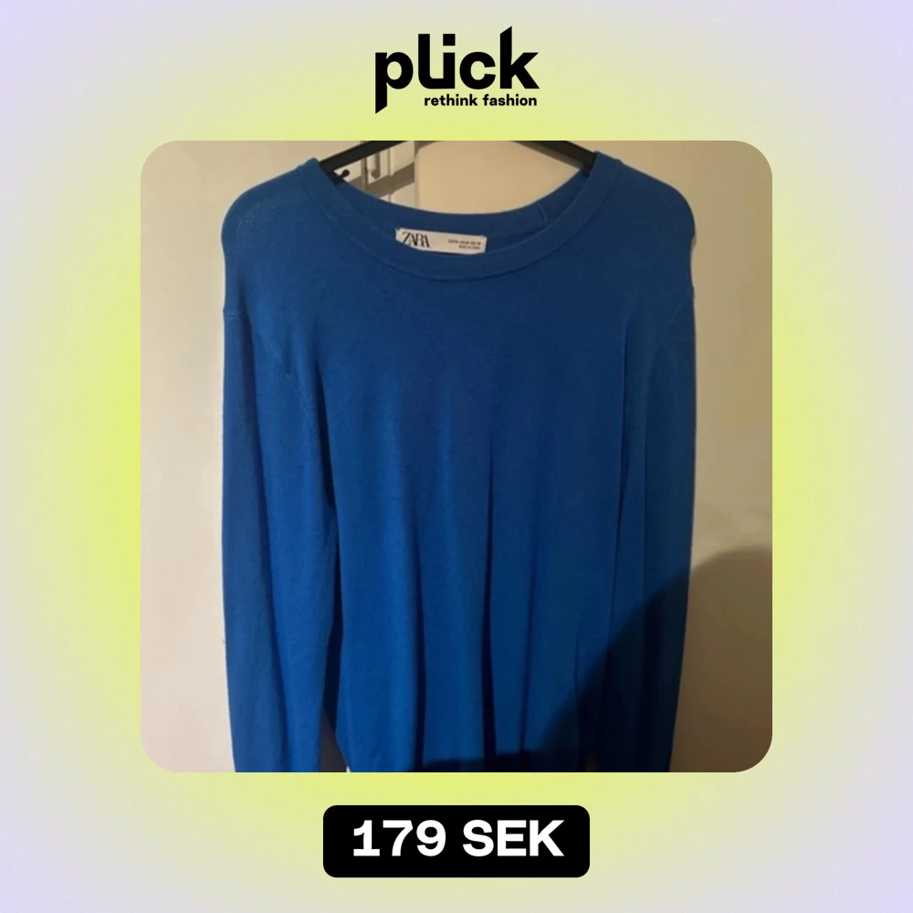 Säljer en snygg blå tröja från Zara i storlek M. Perfekt för både vardag och festliga tillfällen. Tröjan har en enkel design med långa ärmar och rund halsringning. Passar bra till jeans eller kjol för en stilren look.