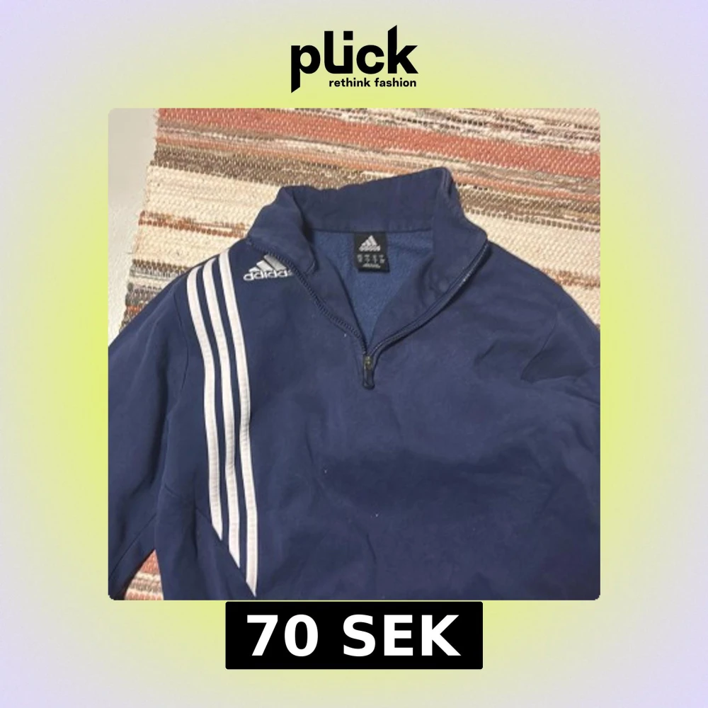 Säljer en blå tröja från Adidas med dragkedja och de klassiska tre vita ränderna på ena sidan. Perfekt för en sportig look eller avslappnad stil. Tröjan har långa ärmar och en hög krage.