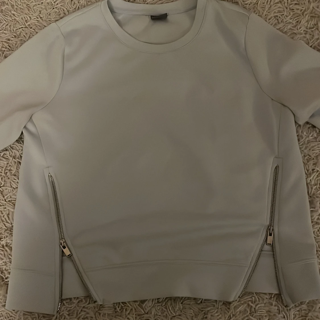 Säljer en stilren blå tröja med coola dragkedjor på sidorna. Perfekt för en casual look och passar till det mesta. Tröjan har en normal passform och är gjord i ett mjukt material som känns skönt mot huden.