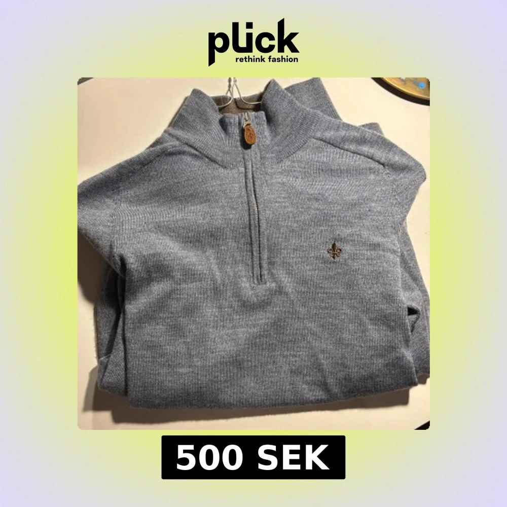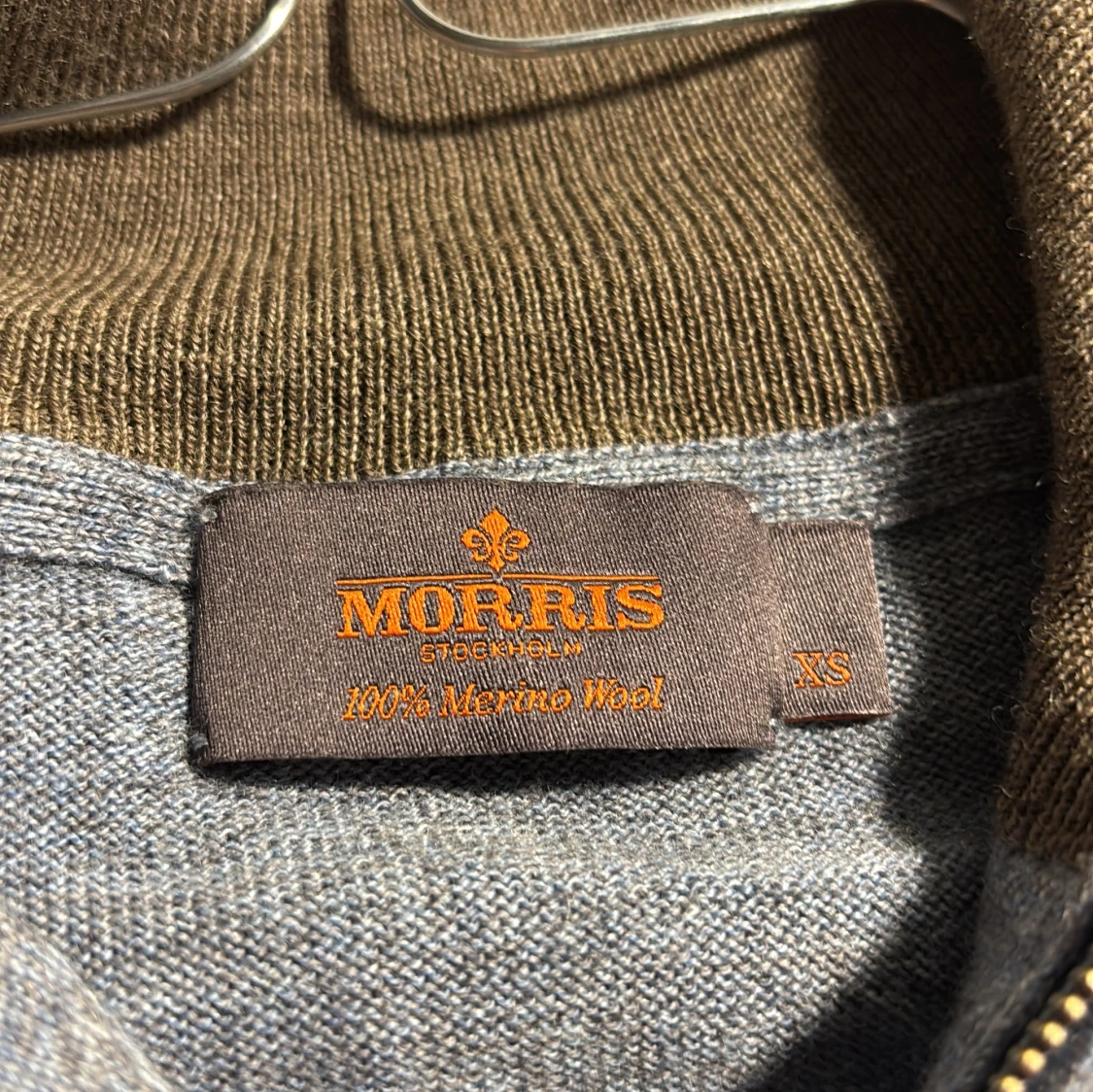 Snygg blå stickad tröja från Morris. Tröjan har half zip med läderdetalj vid dragkedjan och en broderad logga på bröstet. Perfekt för lager-på-lager och passar till både jeans och chinos. Aldrig använd. Pris kan diskuteras vid snabb affär.