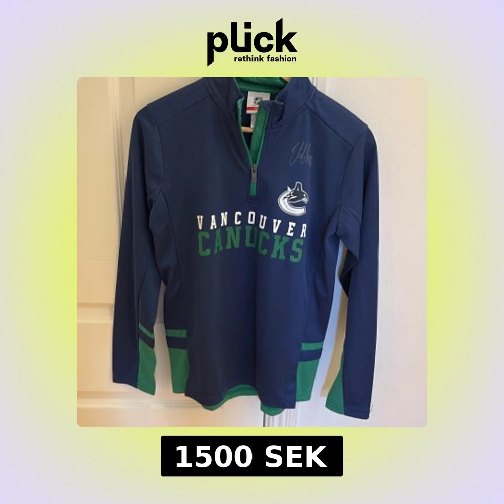 Säljer en blå långärmad tröja från NHL med Vancouver Canucks-logga och text framtill. Tröjan har gröna detaljer vid ärmslut, nederkant och dragkedja vid halsen. Perfekt för hockeyfans som vill visa sitt lagstöd. Signerad av Elias Pettersson