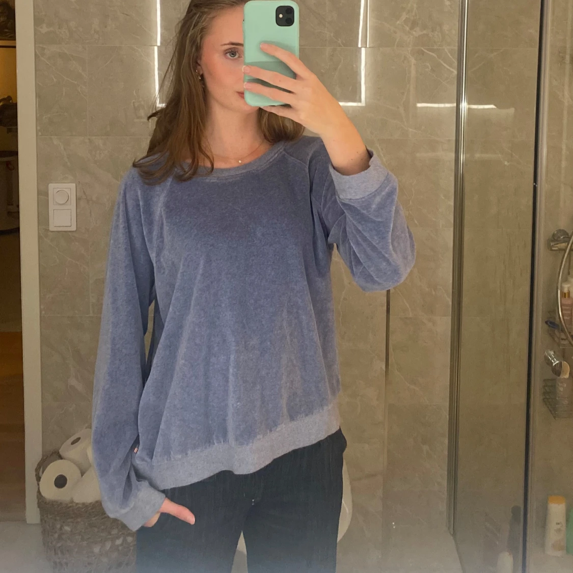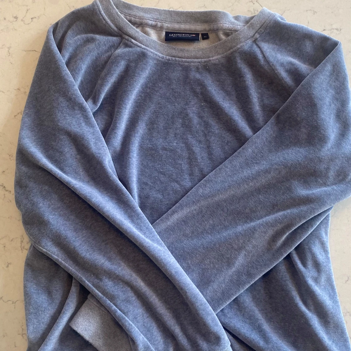 Blå velour tröja från lexington i storlek XL. Ser mer ut som en M enligt mig som brukar ha storlek S så ha det i åtanke. Gott skick.