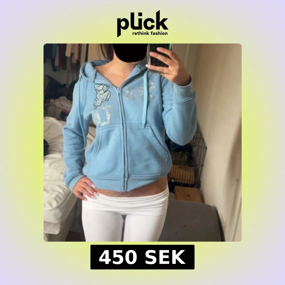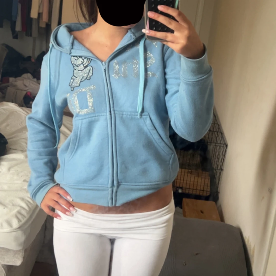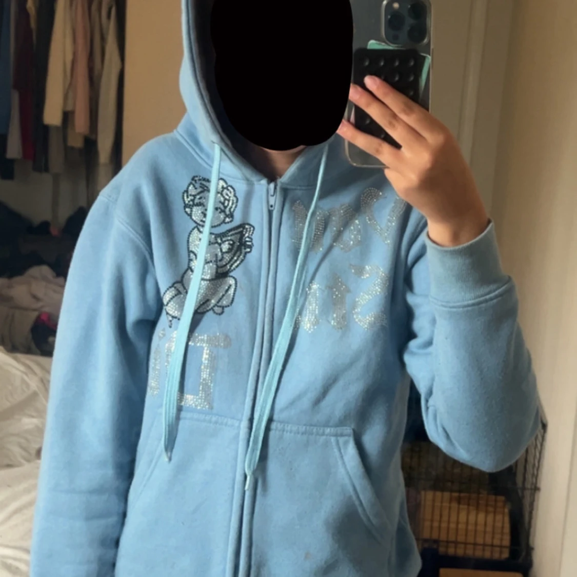 Säljer en ljusblå zip med glitter detaljer den har bra skick men drar kedjan är lite trög men den funkar som vanligt ändå💕