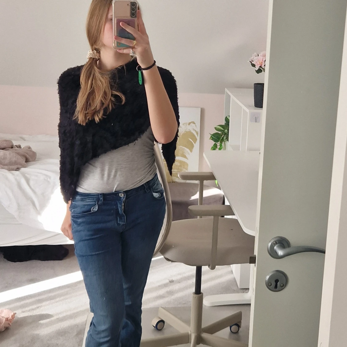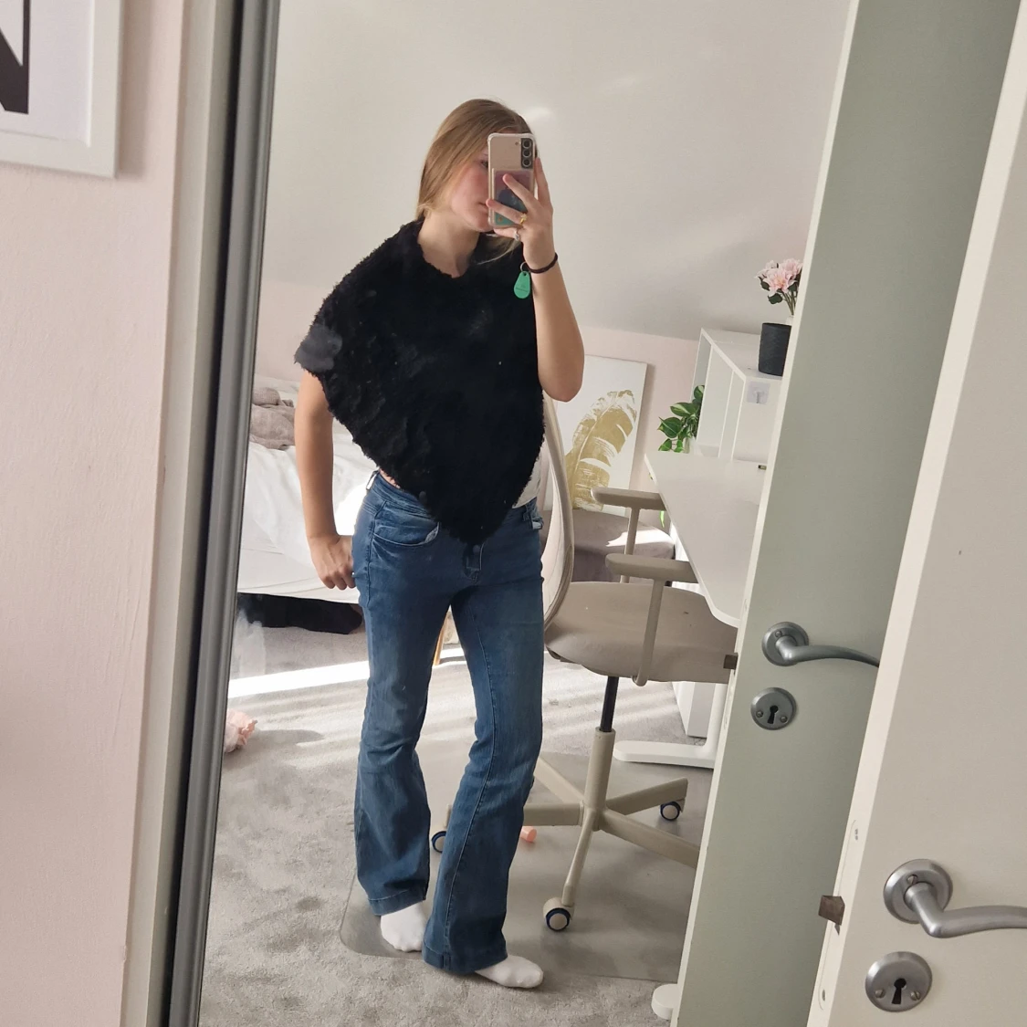En svart kofta som dras på över huvudet och ger en fin extra detalj i din vardagliga outfit Strl 128-140 men passar mig som är strl S/xs/M då tyget är stretchigt och fluffigt