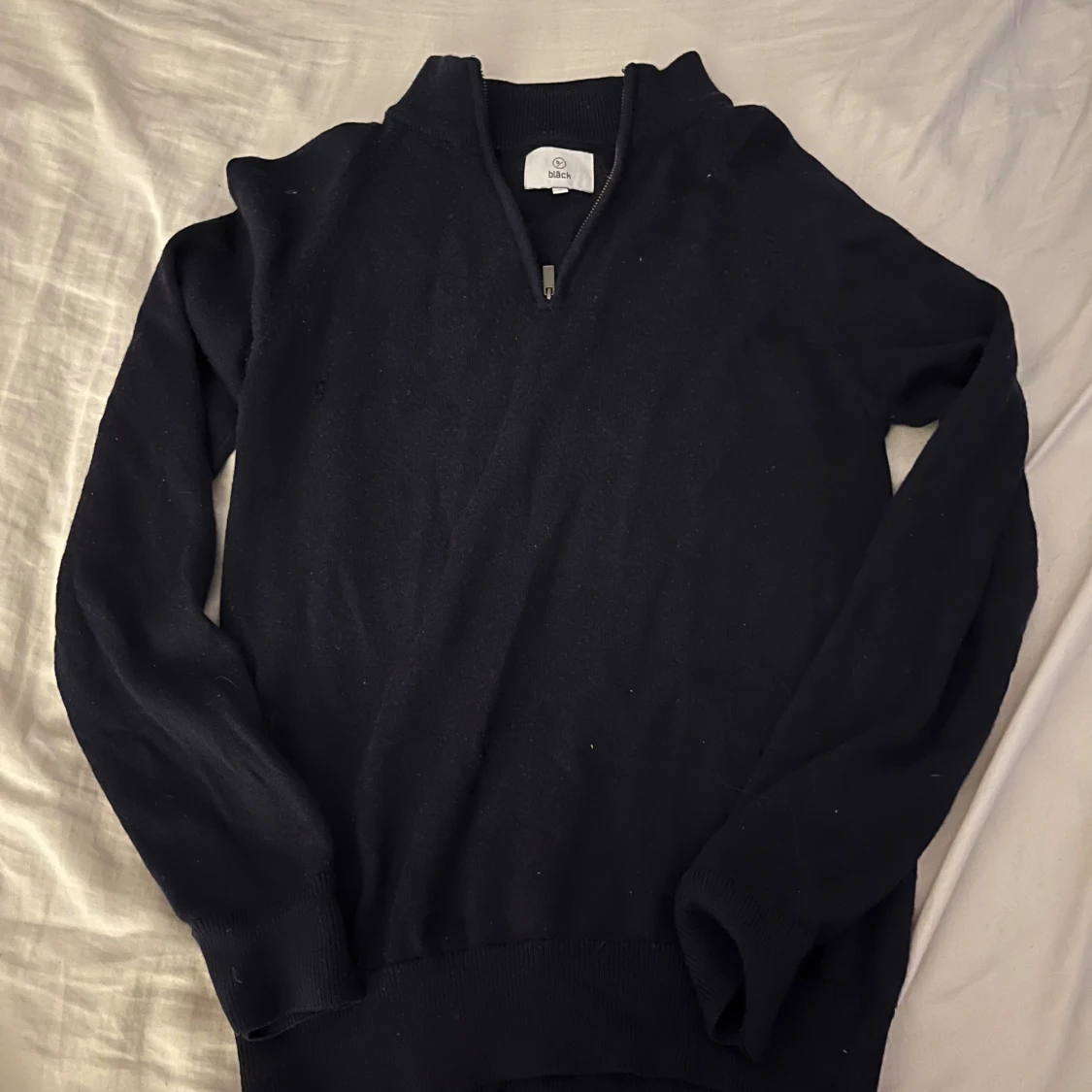 Snygg mörkblå stickad tröja från Bläck i storlek S. Tröjan har en half zip-dragkedja vid halsen och är långärmad med ribbade muddar. Perfekt för dig som gillar enkel och stilren design med lite sportig touch.