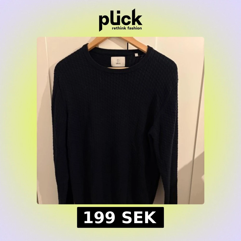 Säljer en mörkblå stickad tröja från Bläck i storlek S. Tröjan har ett diskret strukturerat mönster och rund halsringning. Perfekt för lager-på-lager och passar till jeans.