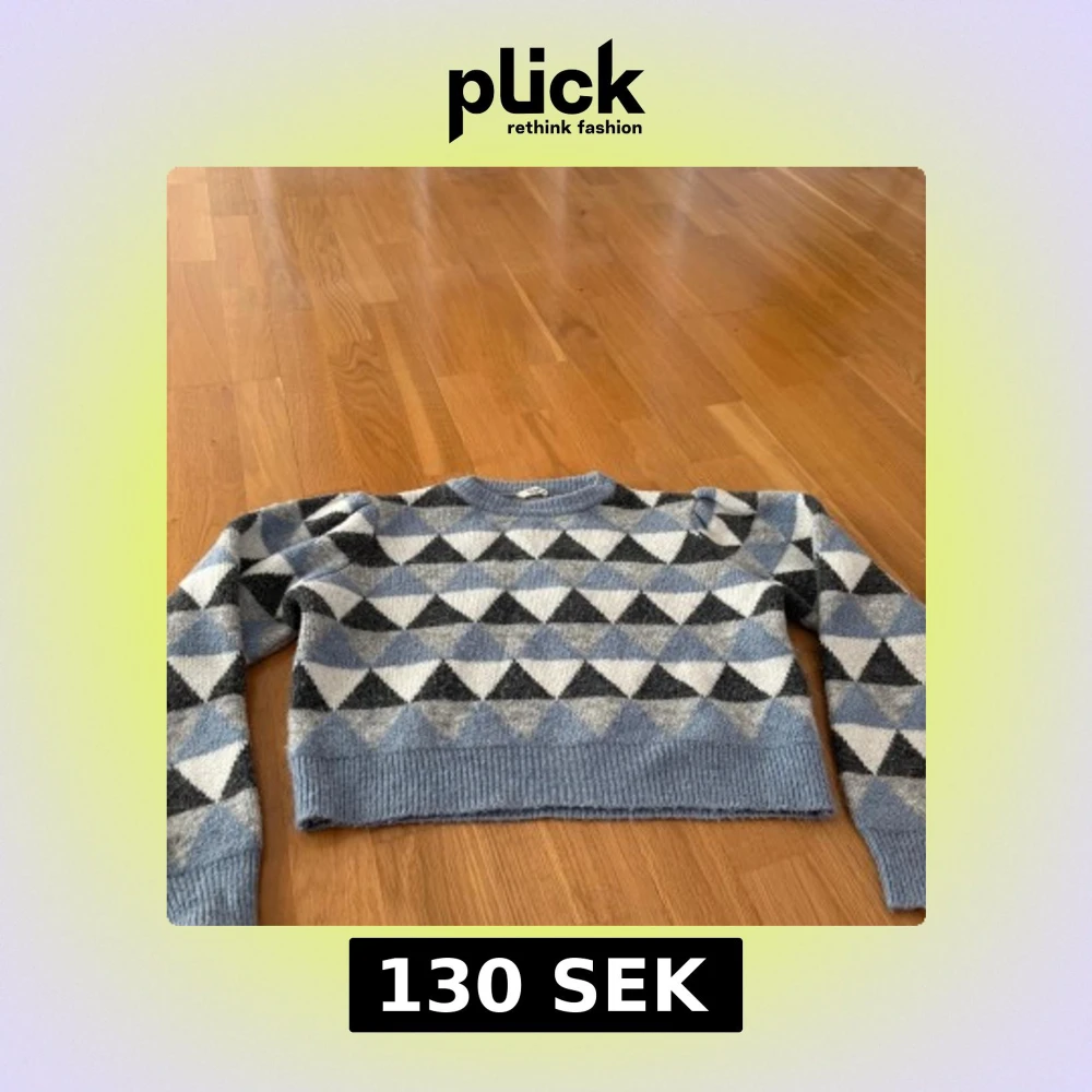 Supermysig stickad tröja från Robin med geometriskt mönster i blått, grått, svart och vitt. Tröjan har ribbade muddar och rund hals. Perfekt för dig som gillar en cool och unik look med retrovibbar.