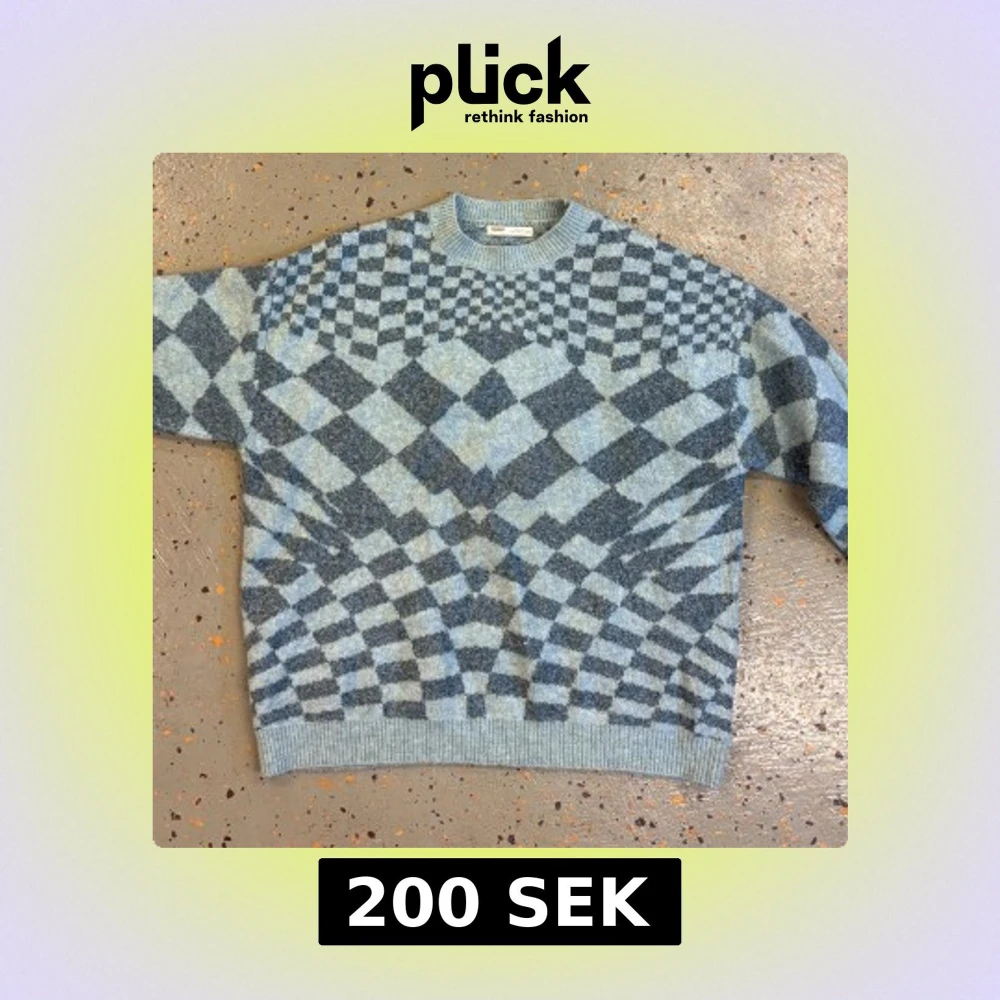 Säljer en stickad tröja i blågrå toner med ett coolt rutigt mönster. Tröjan har rund halsringning, långa ärmar och ribbade muddar. Perfekt för dig som gillar unika statement-plagg.