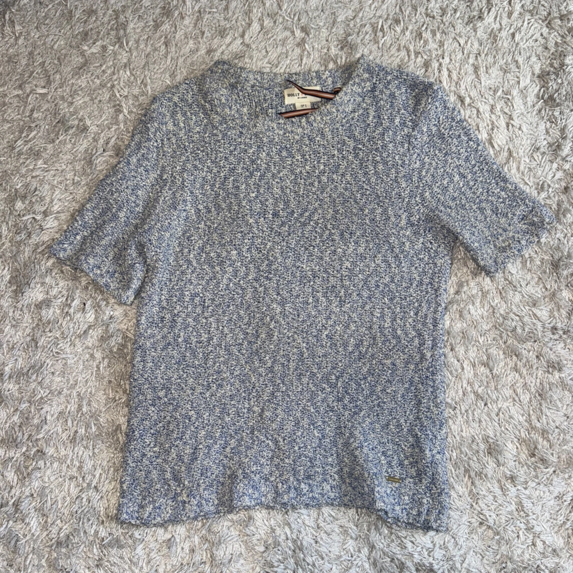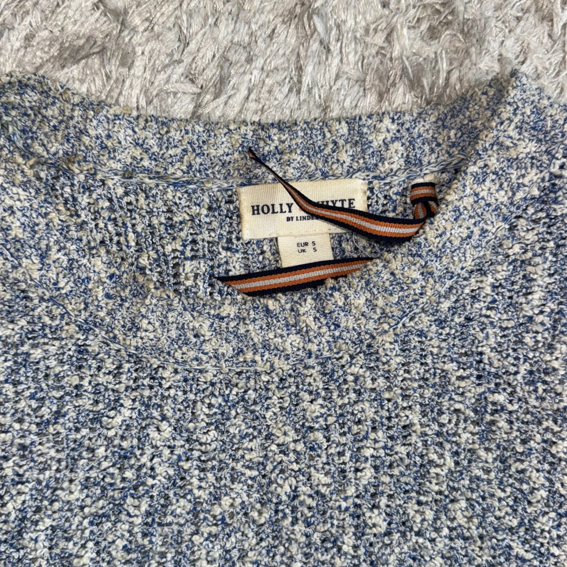 Säljer en blåmelerad stickad topp från Holly & White. Tröjan har korta ärmar och rund halsringning. Materialet är mjukt och ger en avslappnad men ändå stilren look. Perfekt för vår och sommar!