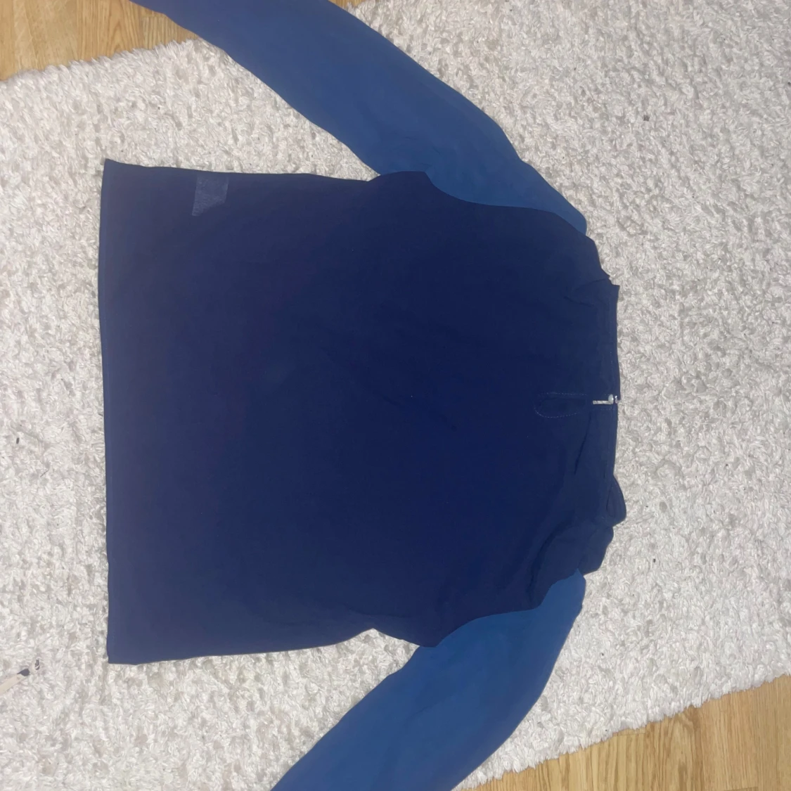 Säljer en stilren mörkblå topp/blus med långa, lite tunnare ärmar. Storleken på tröjan är S. Toppen har en enkel design som gör den lätt att matcha med olika outfits.