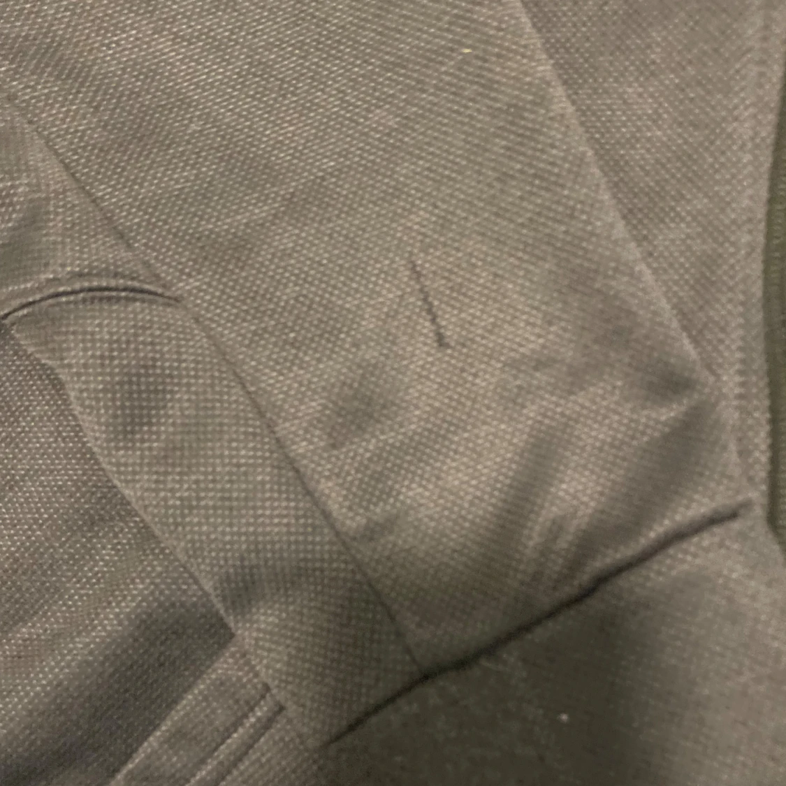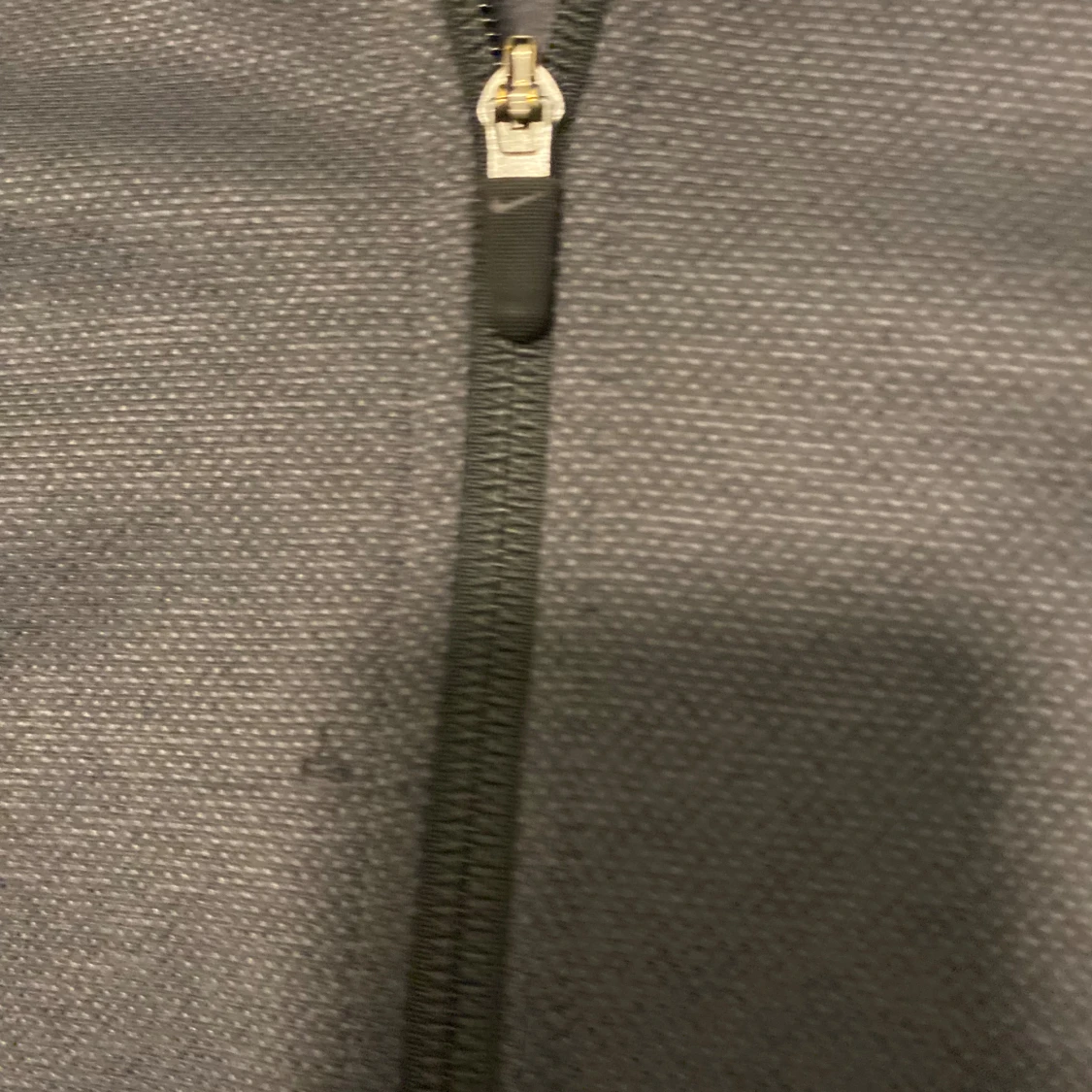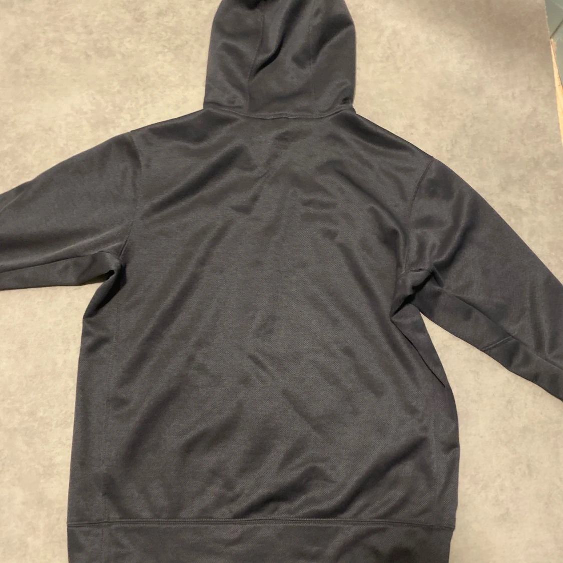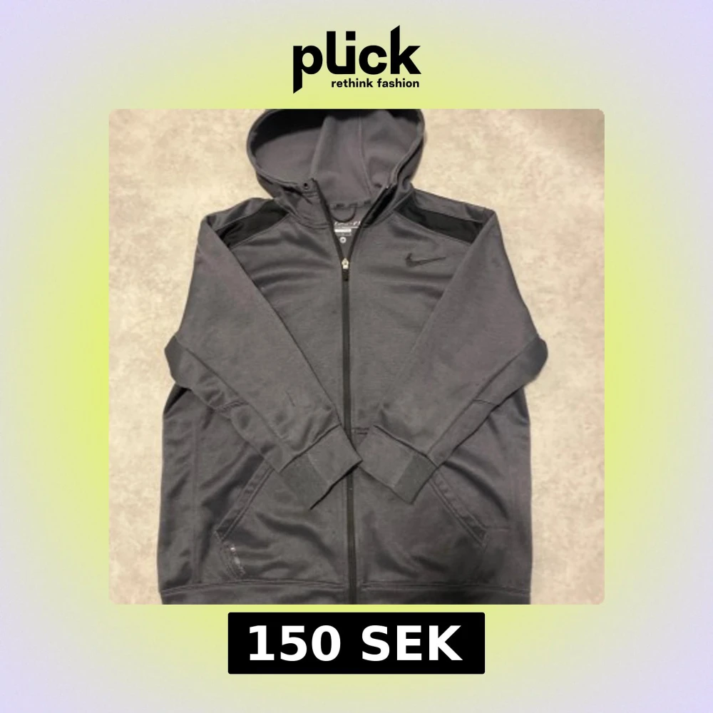 Mörkgrå hoodie från Nike med Therma-Fit-teknologi. Tröjan har huva, hel dragkedja och två fickor framtill. Perfekt för kyliga dagar och träning. Klassisk Nike-logga på bröstet och mjukt fleecefoder på insidan. Har några slitningar men inget som direkt syns vid användning. Längd längd 67cm, bredd 58cm, armlängd 40cm