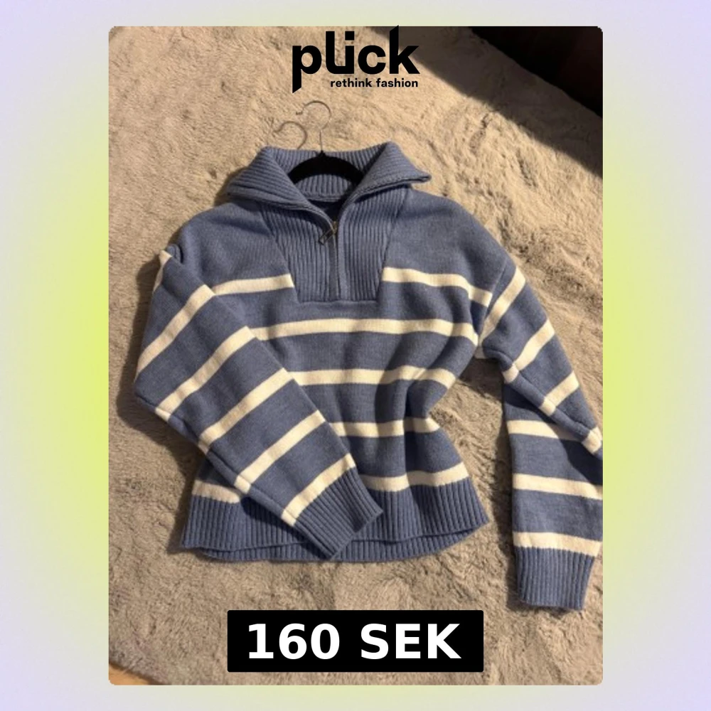 Säljer en blå stickad tröja med vita ränder och zip framtill. Tröjan har en bred krage, ribbade muddar och är långärmad. Perfekt för dig som gillar chill och snygg stil. Materialet är mjukt och känns skönt mot huden. Oanvänd! Passar S/M