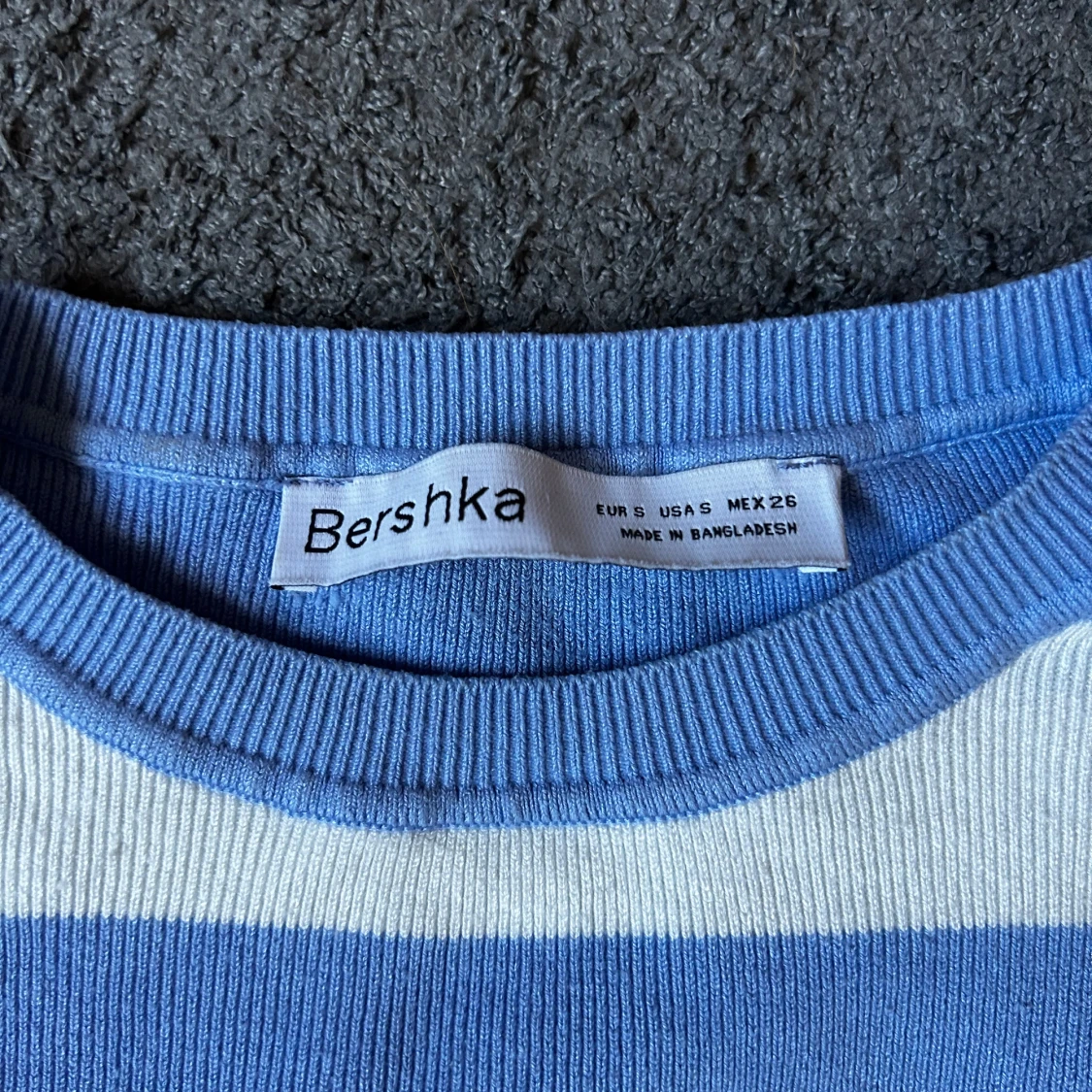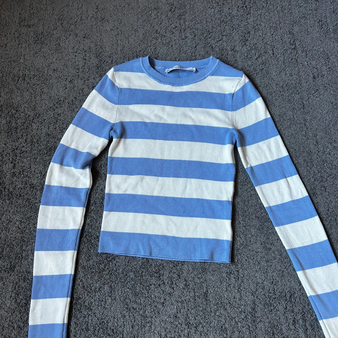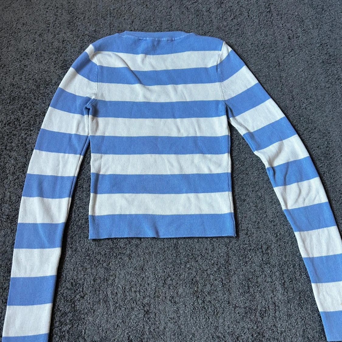 Superfin långärmad tröja från Bershka i blått och vitt med breda ränder. Tröjan är ribbad och har en tight passform med rund halsringning. Har en superliten fläck på baksidan av ärmen (se sista bilden)💞