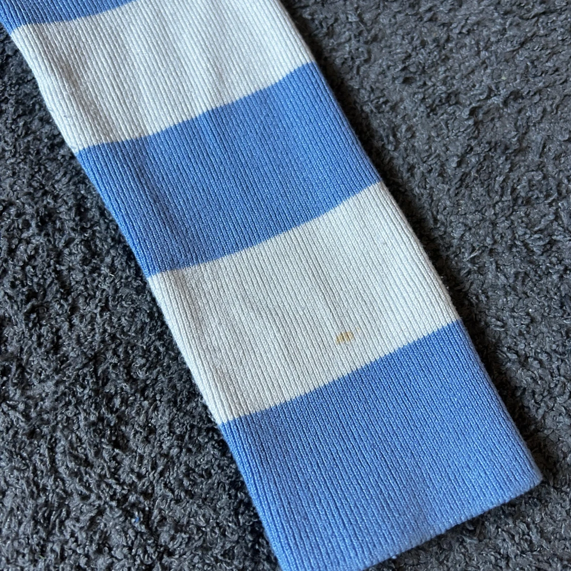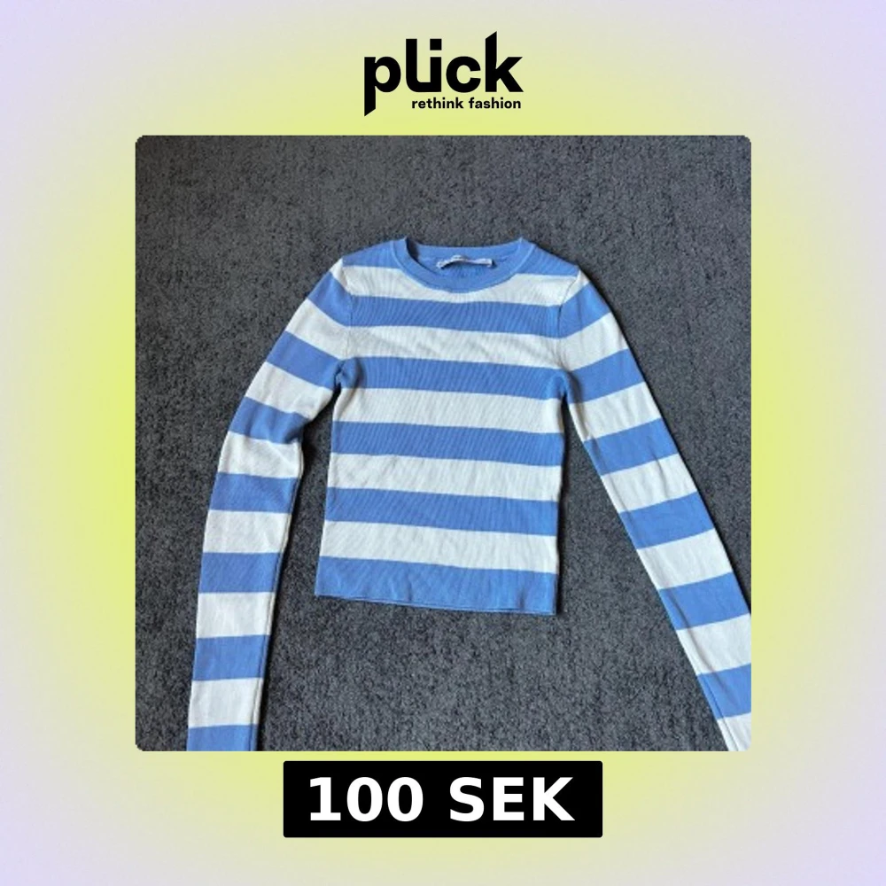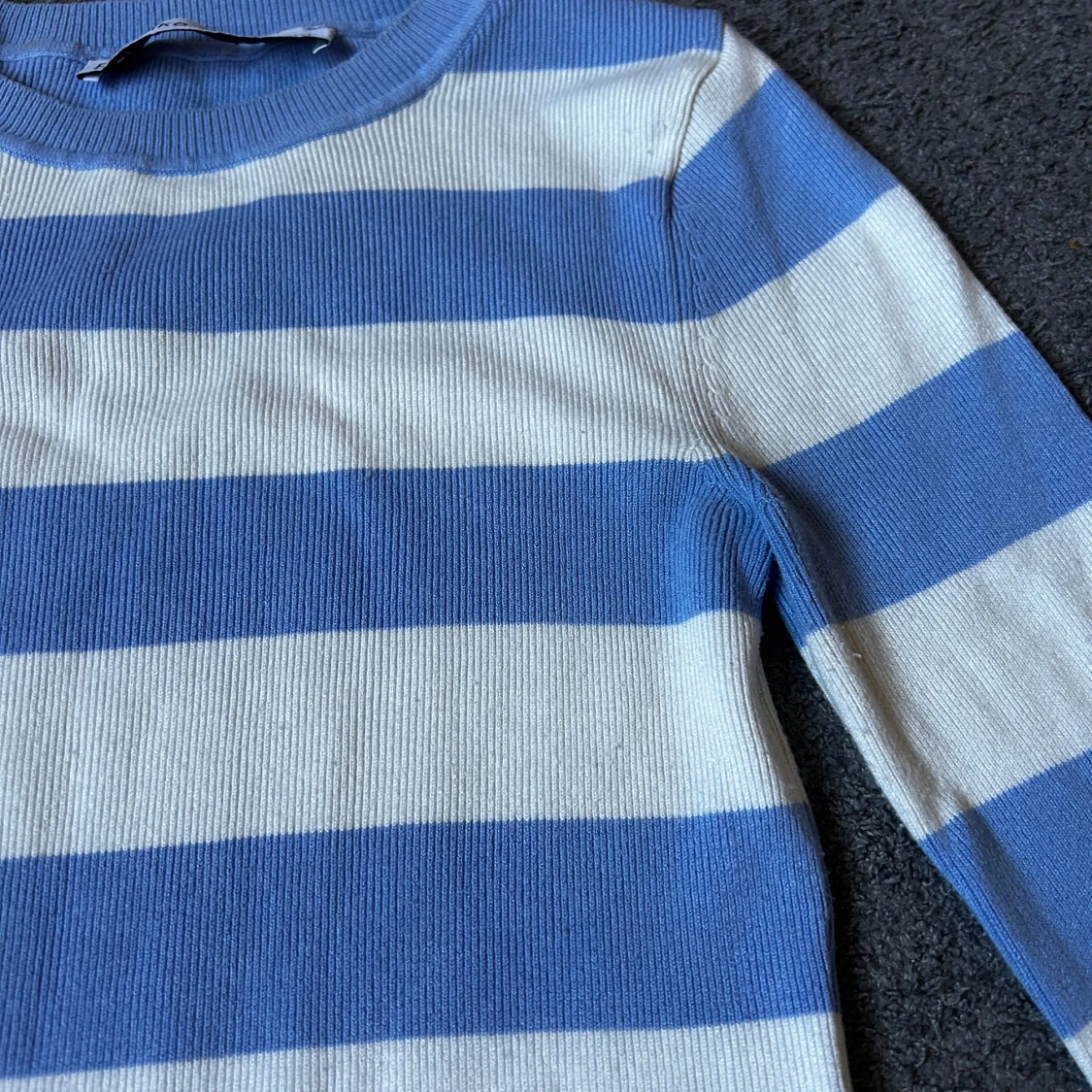 Superfin långärmad tröja från Bershka i blått och vitt med breda ränder. Tröjan är ribbad och har en tight passform med rund halsringning. Har en superliten fläck på baksidan av ärmen (se sista bilden)💞