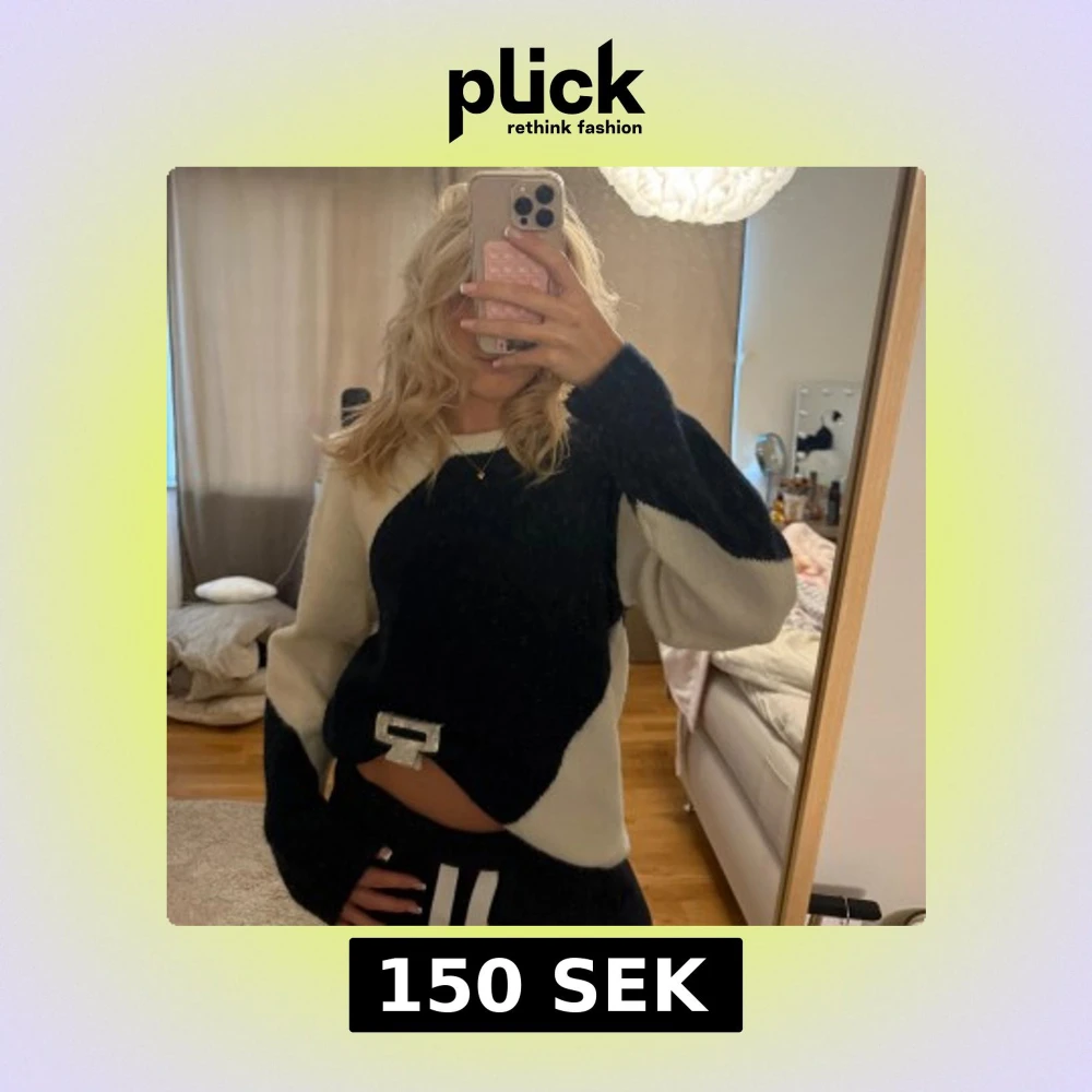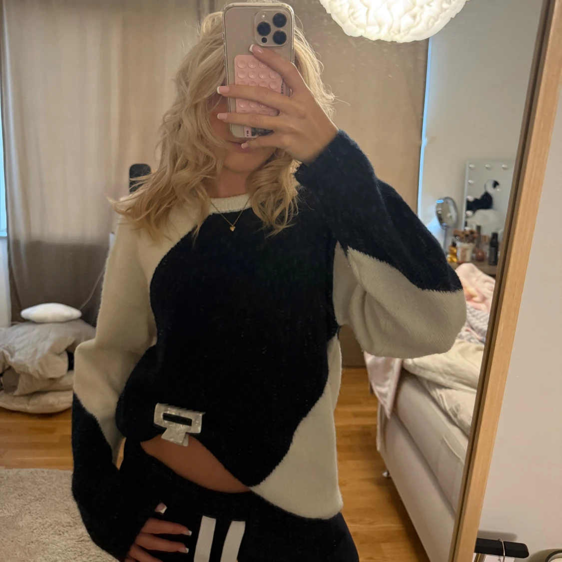 Säljer en svartvit stickad tröja med coolt, abstrakt mönster. Tröjan har croppad passform och långa ärmar. Perfekt för dig som gillar en trendig och avslappnad stil.