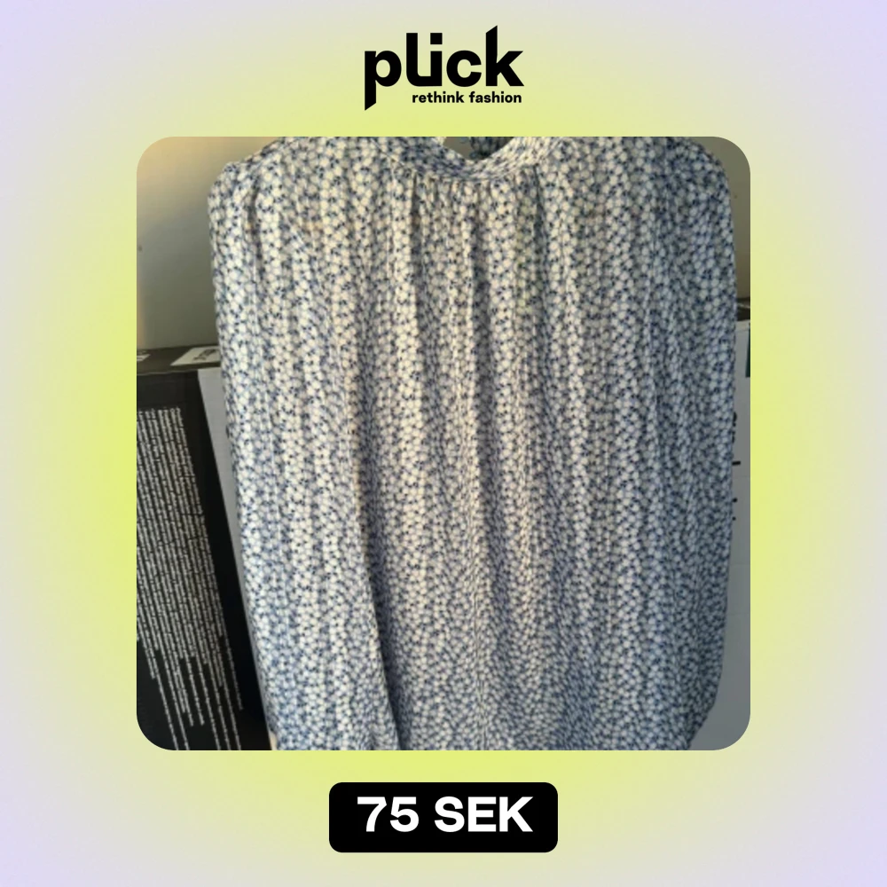 Säljer en söt blommig blus från H&M i storlek S. Den är gjord av 100% återvunnen polyester och har ett fint mönster med små blommor i blått och vitt. Perfekt för vår och sommar!