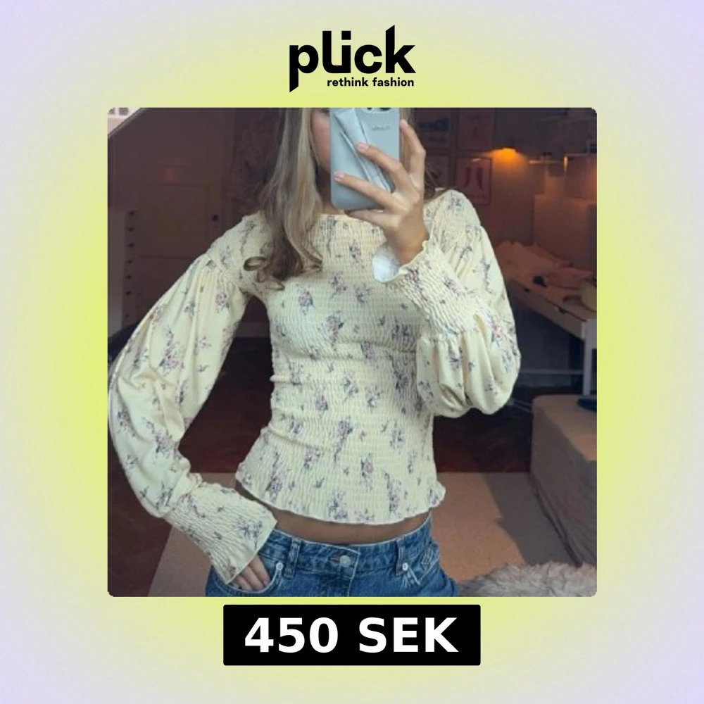 Säljer en söt blommig topp i ljusgul nyans med långa ärmar och smockdetaljer. Toppen har en figurnära passform och ett romantiskt blommönster. Perfekt för en stilfull vardag eller en speciell kväll.