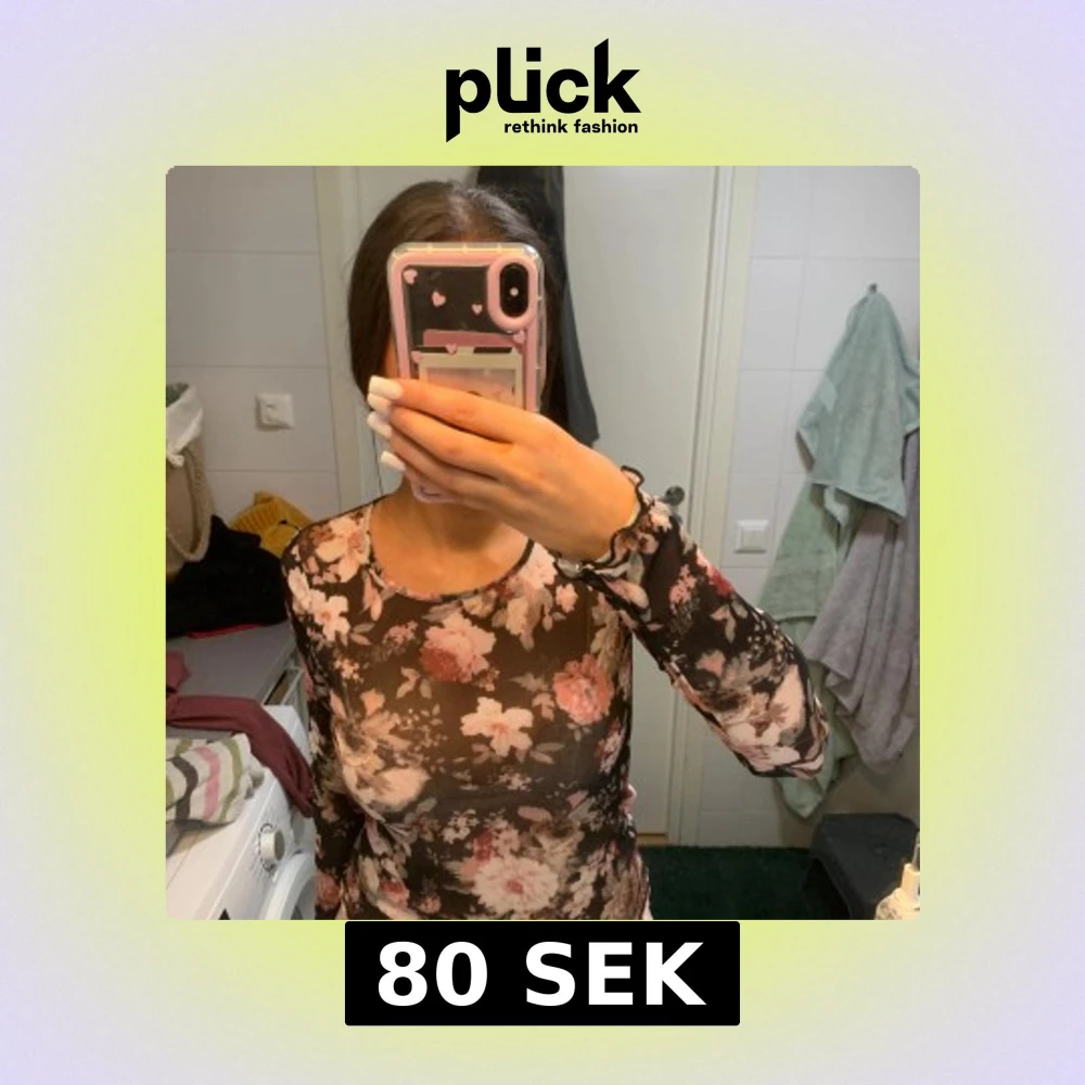 Säljer en transparent mesh topp med blommigt mönster i rosa, beige och vitt på svart botten. Toppen har långa ärmar och tight passform, perfekt för att styla lager på lager. Fina volangdetaljer vid ärmslut för extra vibe.