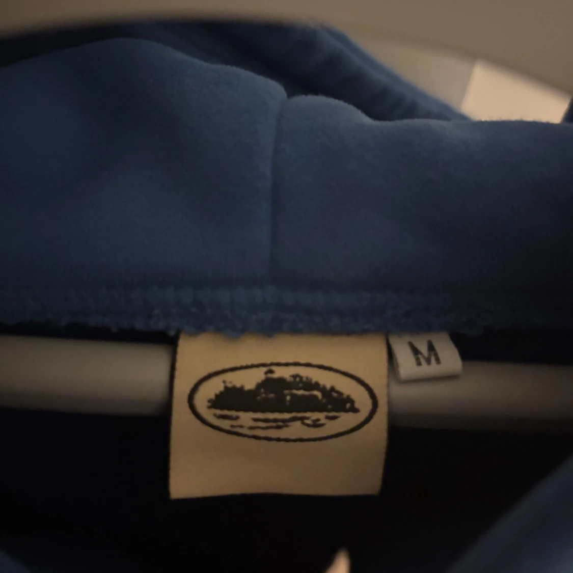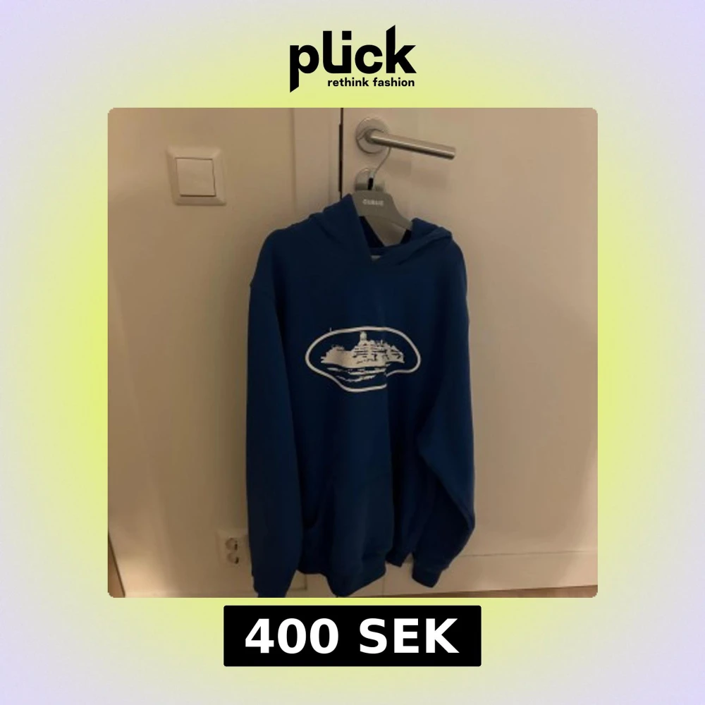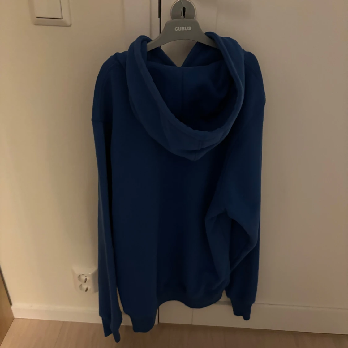 Säljer en blå hoodie med ett vitt tryck på framsidan. Tröjan har en klassisk design med huva och långa ärmar. Perfekt för en avslappnad stil.