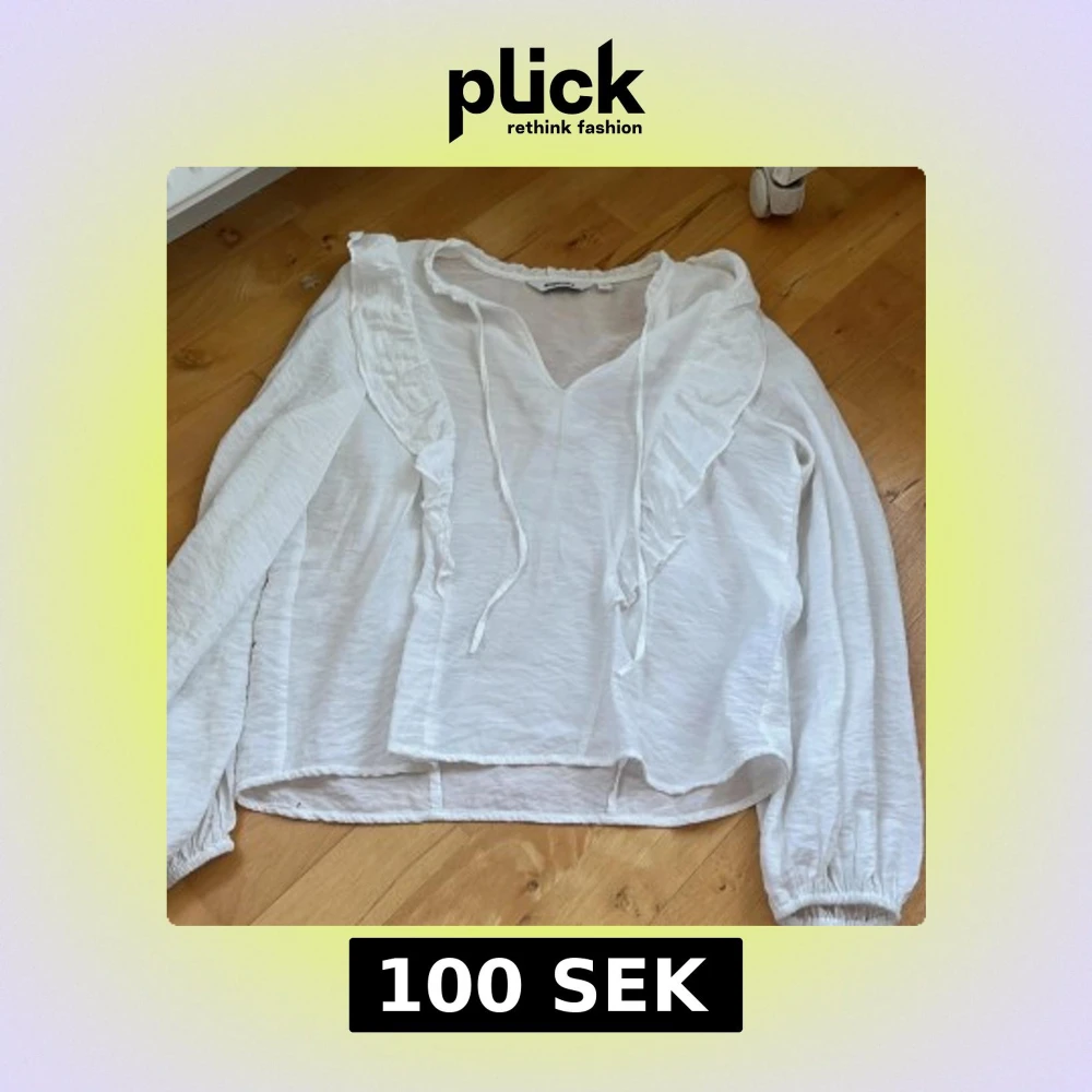 Säljer en vit blus från Kappahl i storlek S. Blusen har långa ärmar med resår vid ärmslut, v-ringad hals med snörning och snygga volangdetaljer längs framsidan. Perfekt för dig som gillar romantisk och feminin stil.