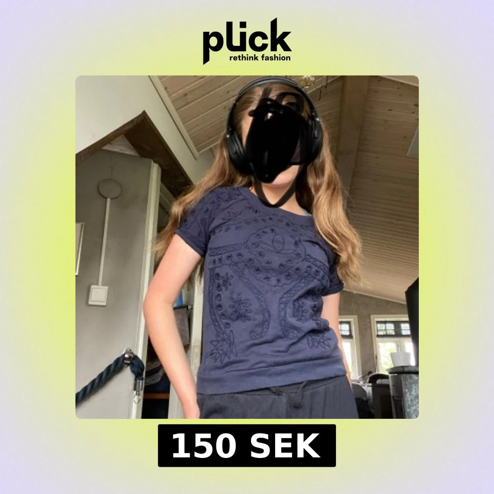 Säljer en mörkblå t-shirt från Juicy Couture med snygga broderade detaljer och blommönster framtill. Står att det är storlek L, MEN är väldigt liten i storlek så skulle säga att det är XS.